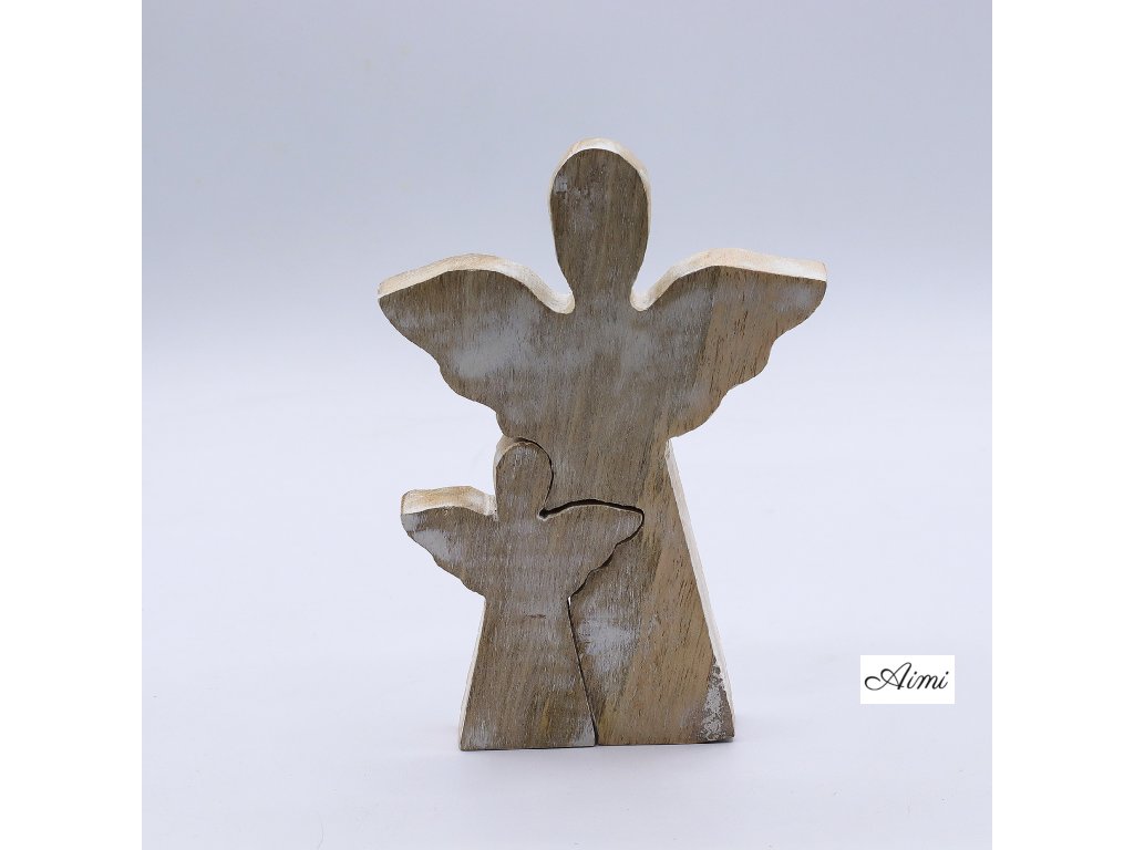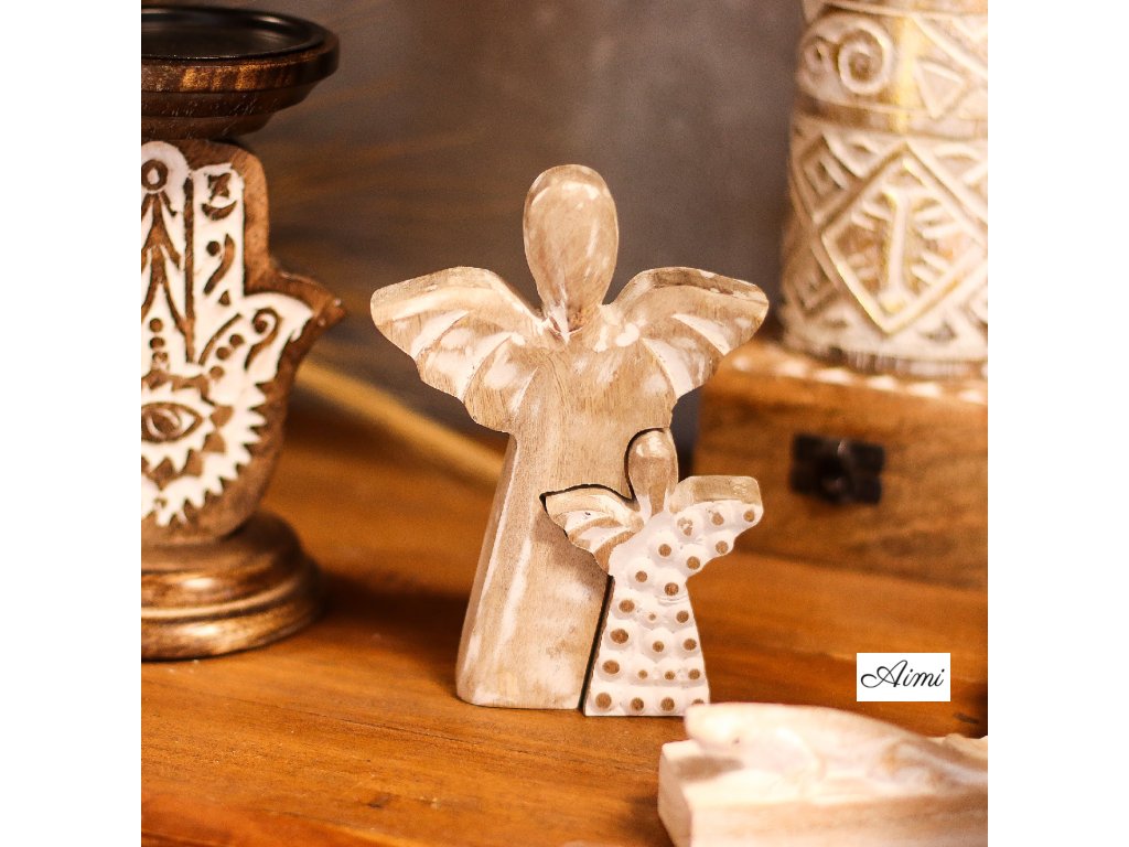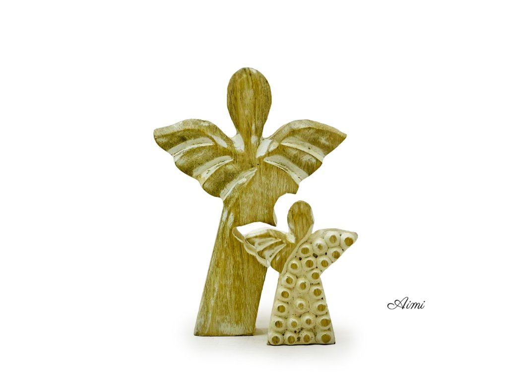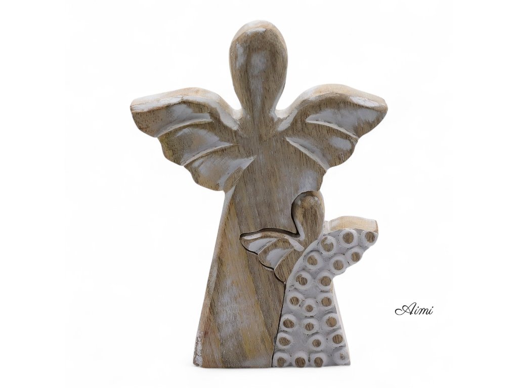 Anjel z Mangového Dreva s Malým Anjelom - Biela Vymývaná - 15 cm