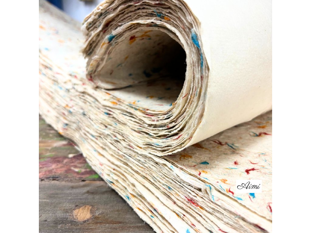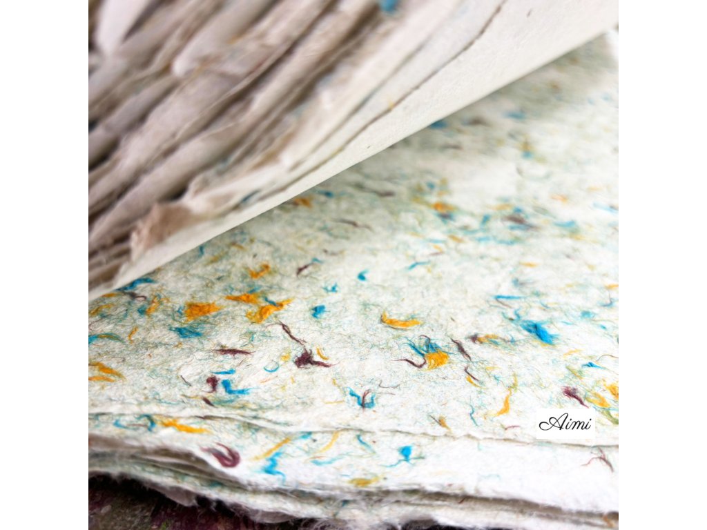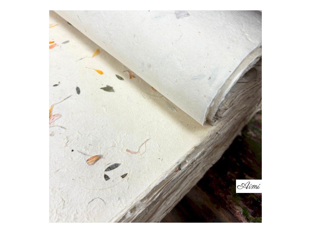 Ručne vyrábaný v Nepále z udržateľne získavanej kôry kríka Daphne, tento papier je obohatený o jemné zelené bavlnené vlákna, ktoré mu dodávajú decentný botanický vzhľad. Každý hárok je sušený na slnku a nesie jedinečné textúry, ktoré odrážajú majstrovstvo himalájskych remeselníkov.