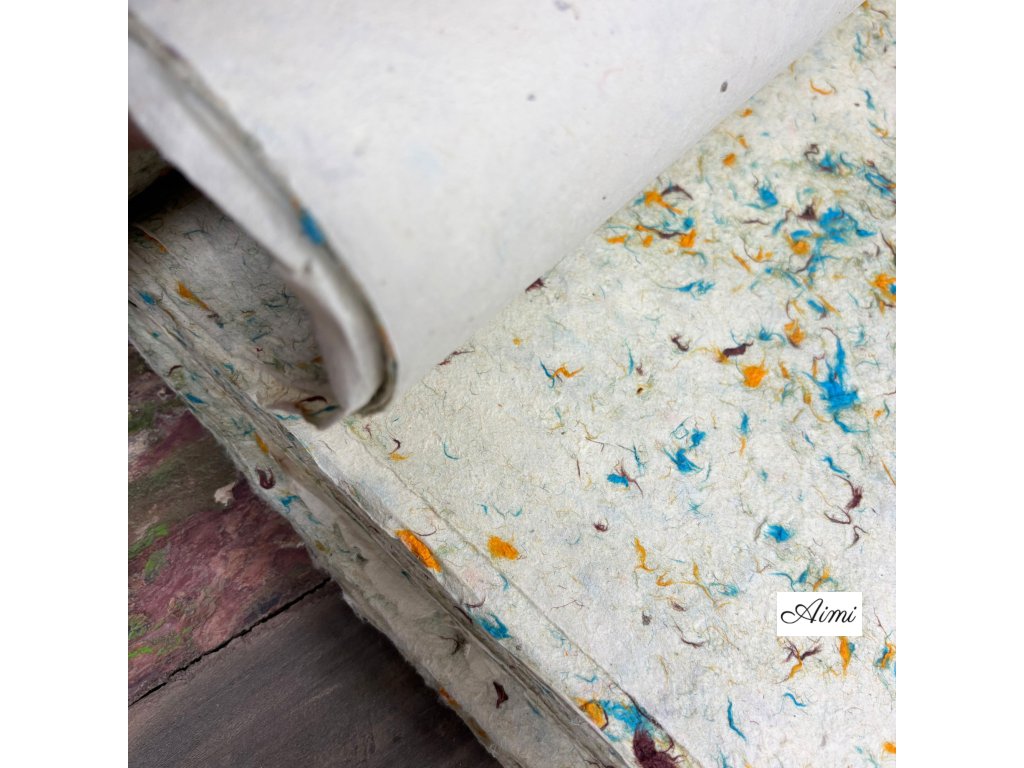 Ručne vyrábaný v Nepále z udržateľne získavanej kôry kríka Daphne, tento papier je obohatený o jemné zelené bavlnené vlákna, ktoré mu dodávajú decentný botanický vzhľad. Každý hárok je sušený na slnku a nesie jedinečné textúry, ktoré odrážajú majstrovstvo himalájskych remeselníkov.
