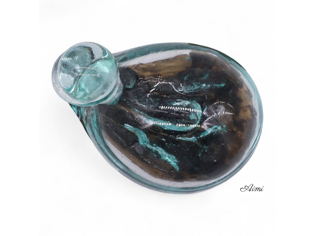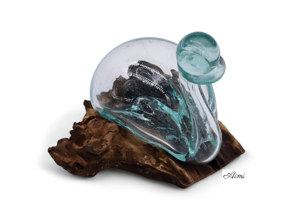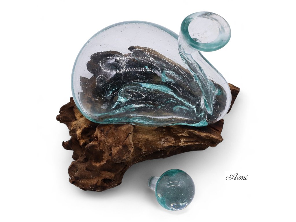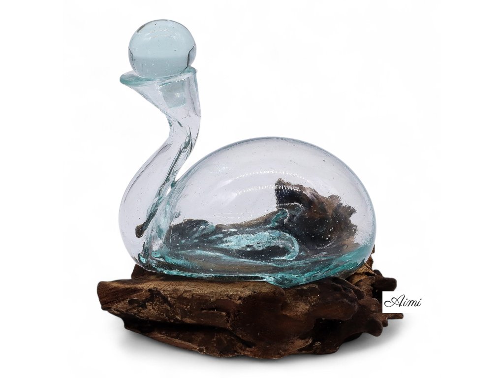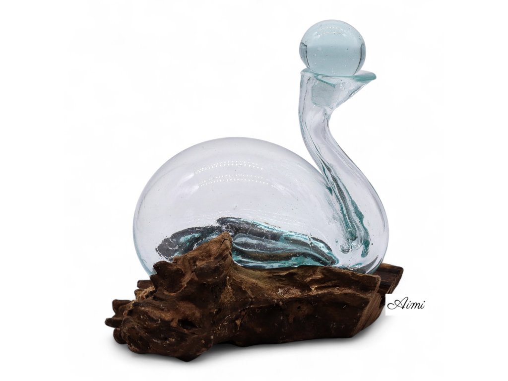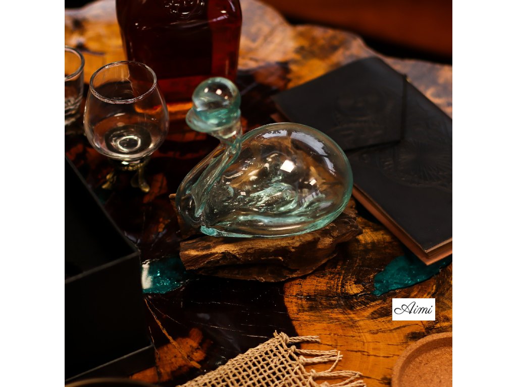 Ručne vyrobená na Bali, tavené recyklované sklo sa nalieva priamo na prírodné drevo, kde sa počas chladenia vytvaruje do pevnej, organickej základne. Súčasťou je aj presne pasujúca sklenená zátka, vďaka ktorej je karafa praktická aj dekoratívna zároveň.