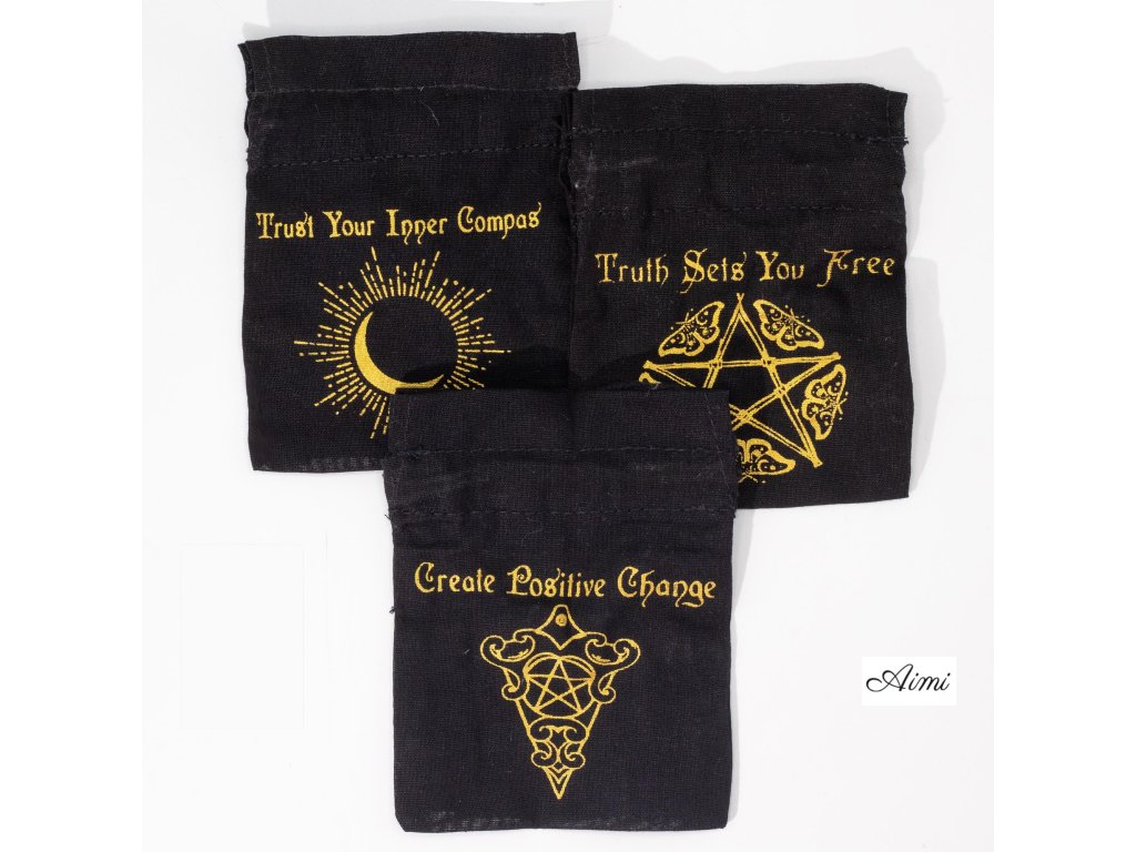 Tento elegantný set 12 ezoterických vrecúšok je vyrobený z kvalitnej čiernej bavlny a zdobený výraznou zlatou potlačou. S tromi obľúbenými ezoterickými motívmi a inšpiratívnymi frázami ide o atraktívne a štýlové balenie pre malé predmety ako sú tromlované kamene, šperky, esenciálne oleje či talizmany.
