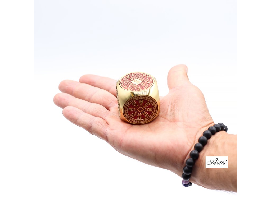 Feng Shui Šťastie – Červeno-mosadzná kocka prosperity – Plochá je precízne vyrobený dekoratívny predmet, ktorý spája tradičnú symboliku Feng Shui s elegantným dizajnom. Zhotovená z kvalitnej mosadze s výraznými červenými prvkami predstavuje bohatstvo, úspech a plynutie pozitívnej energie.