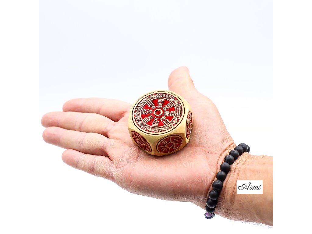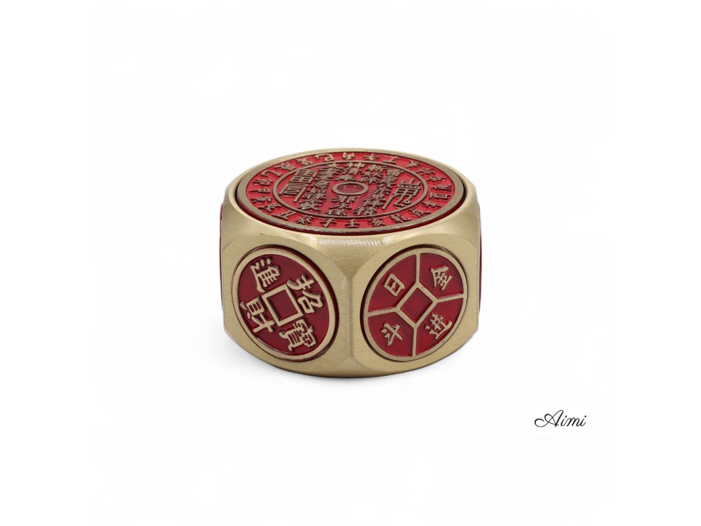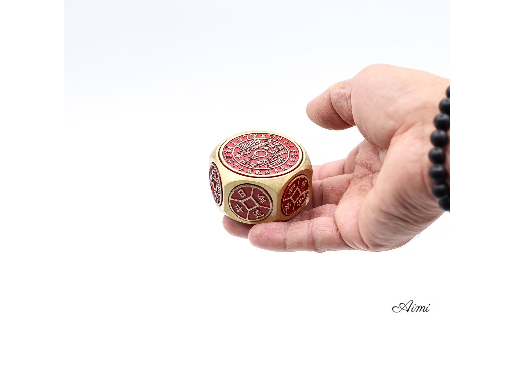 Feng Shui Šťastie – Červený kalendár a mincové kocky – Výber priaznivého dátumu je nádherne spracovaný mosadzný nástroj navrhnutý tak, aby pomohol vyberať najvhodnejšie dátumy pre dôležité udalosti a rozhodnutia. Tento elegantný kúsok spája tradičné čínske kalendárové symboly s motívmi šťastných mincí a odráža feng shui princípy načasovania, šťastia a prosperity.