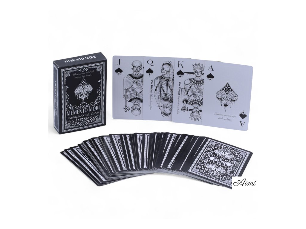 Každý balíček obsahuje 52 štandardných kariet a 2 žolíkov, vytlačených na kvalitnom papieri pre hladké miešanie a dlhú životnosť. Dizajn Memento Mori zdobia detailné motívy lebiek a nadčasové gotické ozdoby – ideálna voľba pre zákazníkov, ktorých priťahuje mystika a symbolika osudu.