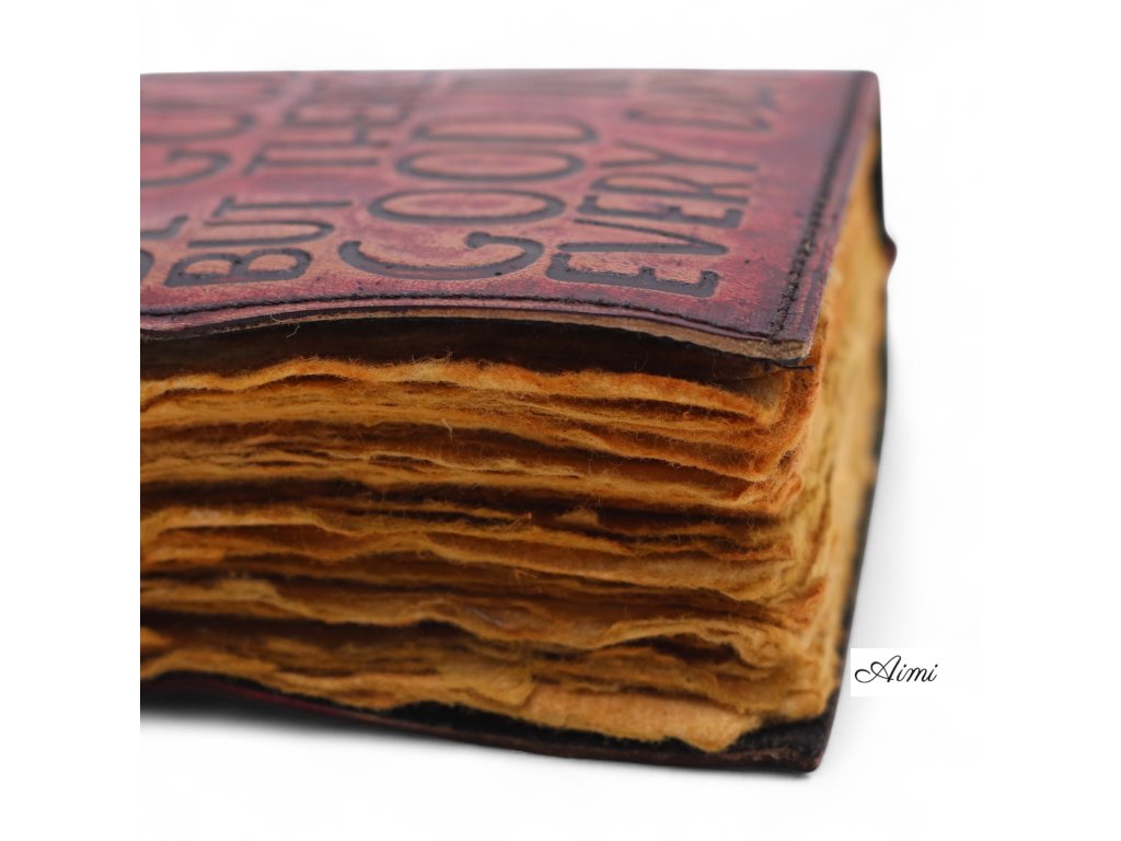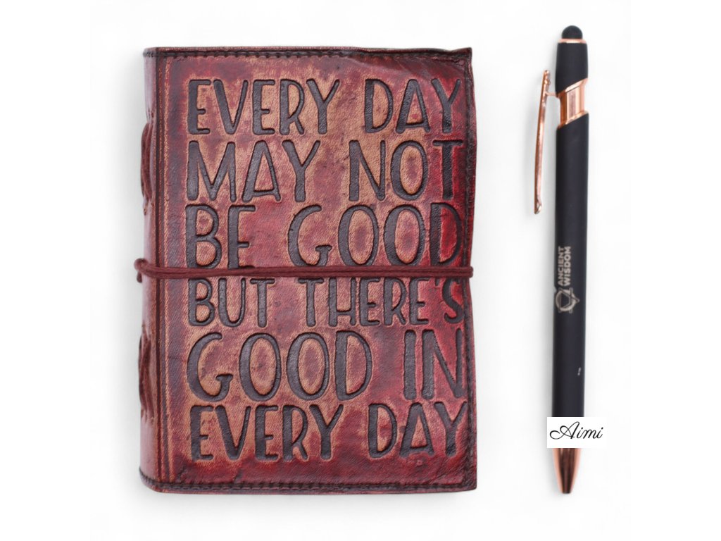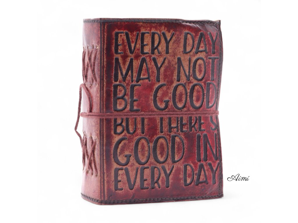 Tento rustikálny kožený zápisník nesie nadčasové posolstvo: „Každý deň nemusí byť dobrý, ale v každom dni je niečo dobré.“ Starostlivo ručne vyrobený má mäkký kožený obal so vytlačeným povzbudzujúcim citátom v bohatej, patinovanej červenej farbe, ktorá mu dodáva teplo a charakter.