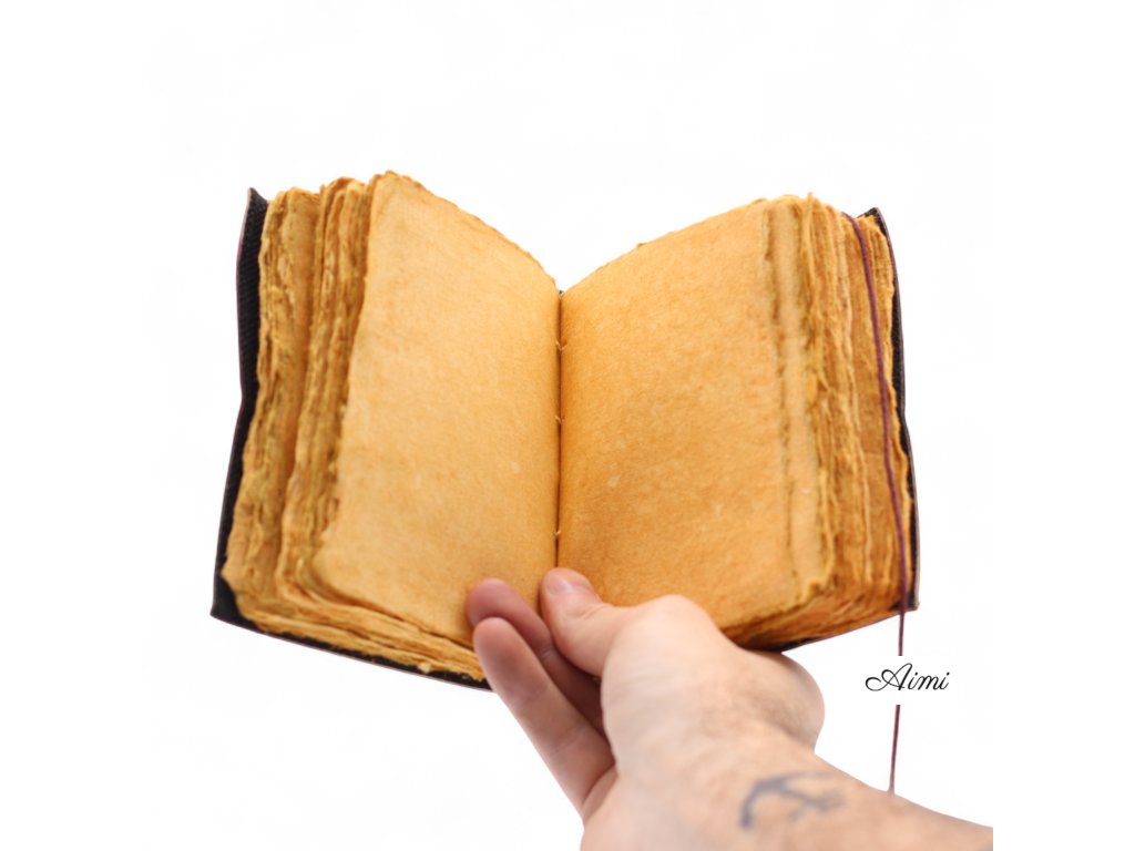 Vo vnútri sa nachádzajú hrubé listy z recyklovaného bavlneného papiera s nerovnými okrajmi, ktoré mu prepožičiavajú autentický vintage vzhľad. Kožená šnúrka na ovinutie ho spoľahlivo uzatvára – ideálny na denníkové zápisky, kreslenie či osobné zamyslenia.