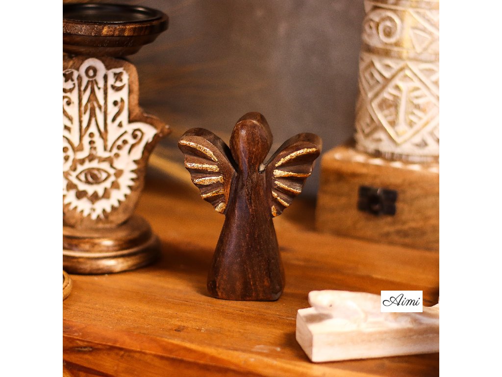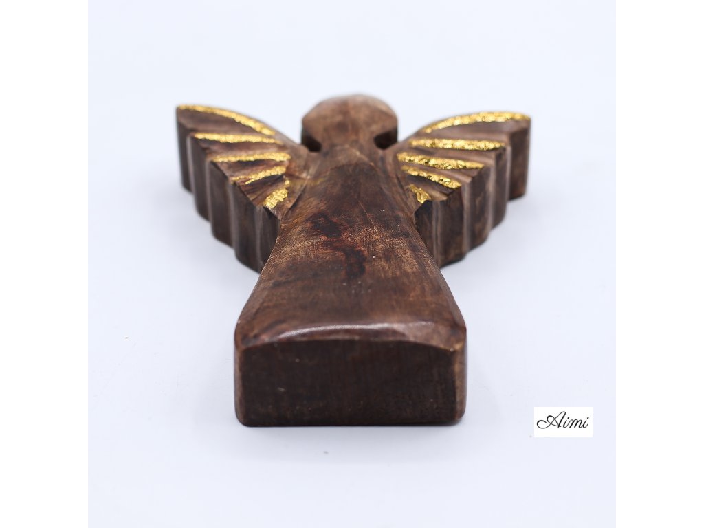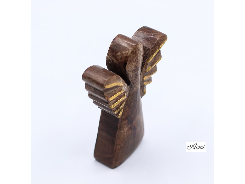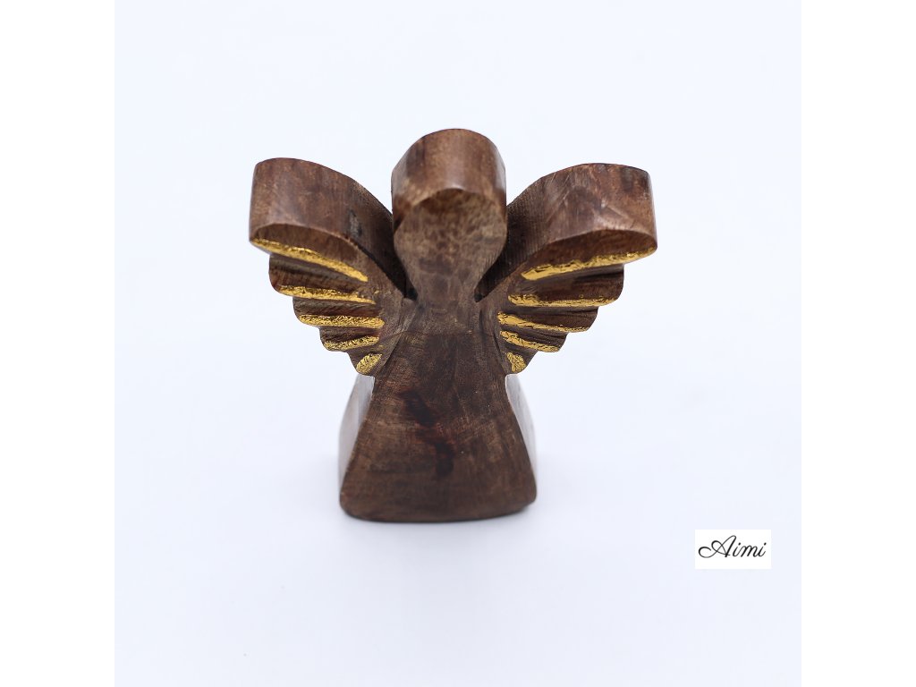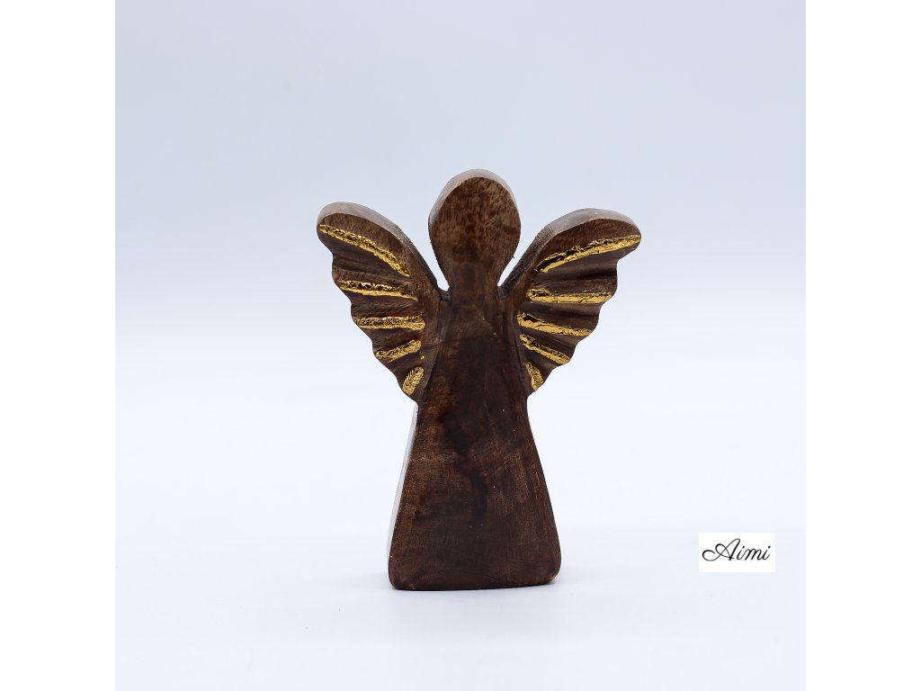 Drevený anjel z mangového dreva so zlatou dekoráciou – 12 cm