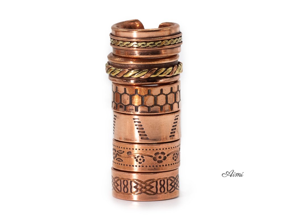 Ručne vyrobené v Indii z masívnej medi, každý prsteň je zdobený rôznorodými vzormi – od jemných rytín až po dvojfarebné prevedenia s mosadznými špirálovými pásmi, ktoré vytvárajú elegantný kontrast.