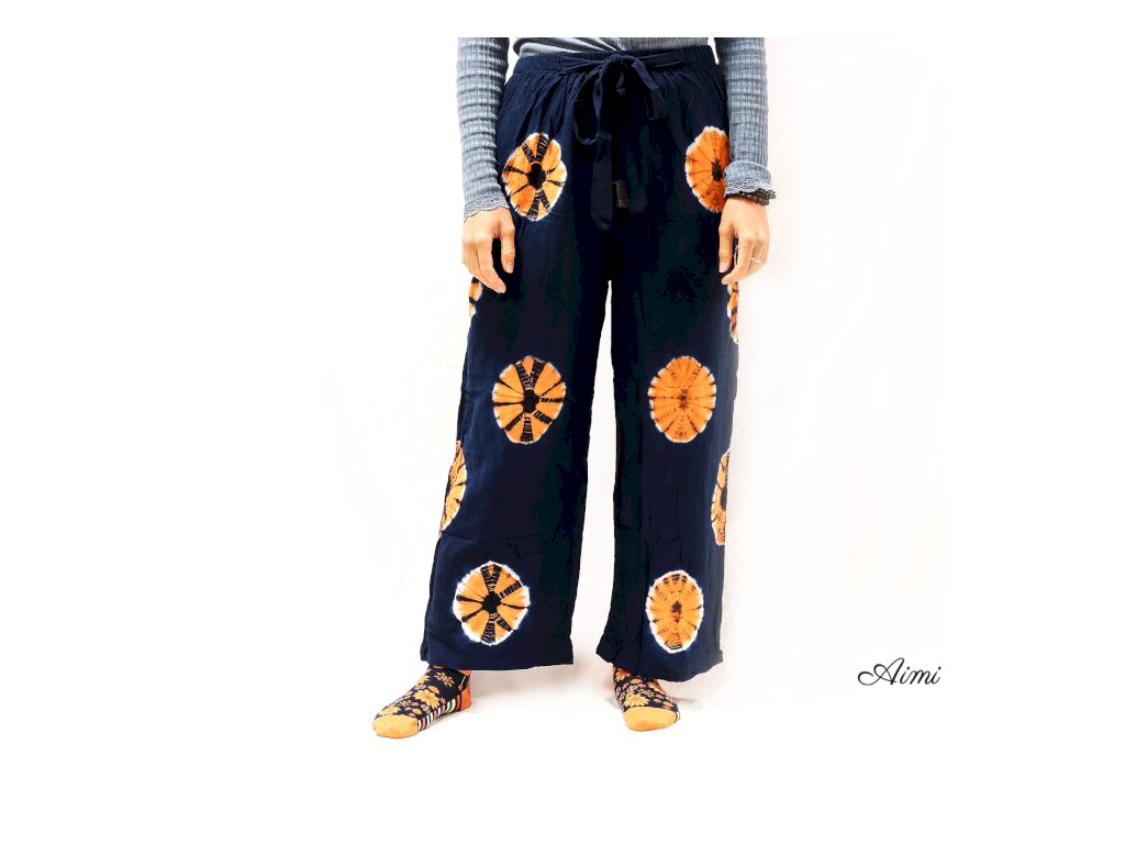 Tieto námornícke voľnočasové nohavice sú ručne vyrobené v Indonézii z priedušnej zmesi ľanu a viskózy, ktorá spája jemnosť s prirodzeným padavým vzhľadom. Žiarivé oranžové batikové kruhy dodávajú výrazný farebný akcent, ktorý okamžite pritiahne pozornosť zákazníkov v predajni.