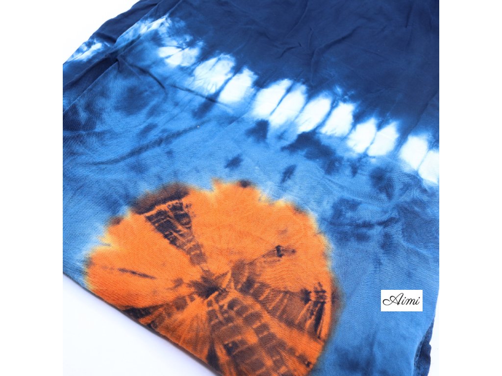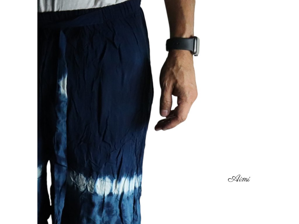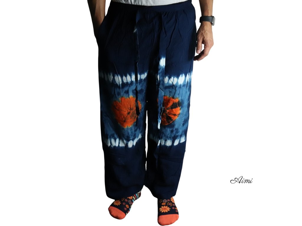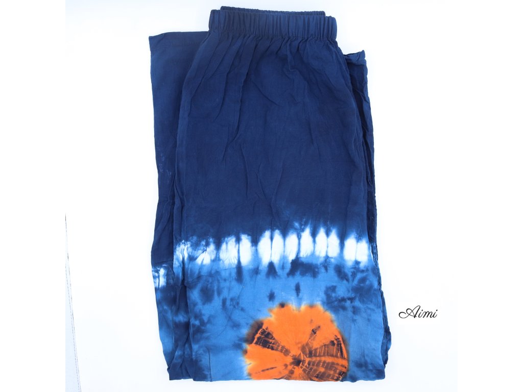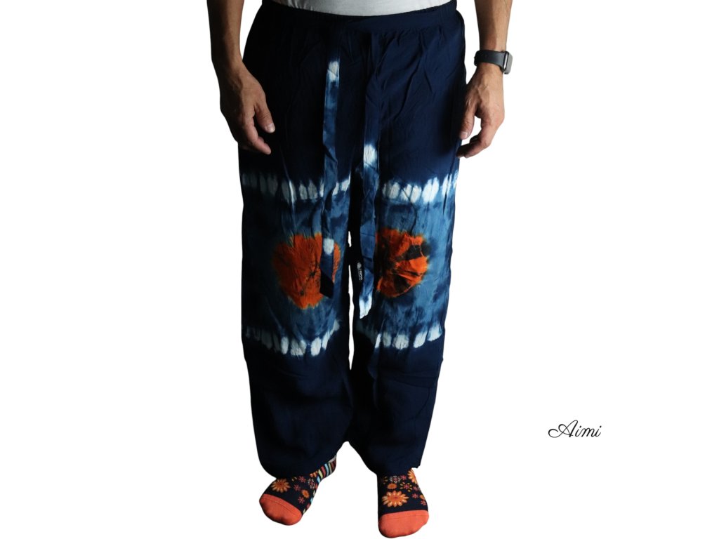 Tieto japonské voľné nohavice v modro–tyrkysovej farbe so žiarivými oranžovými akcentmi sú ručne vyrobené v Indonézii z priedušnej zmesi ľanu a viskózy, ktorá ponúka jemnosť a prirodzené splývanie látky. Uvoľnený, široký strih v kombinácii s nastaviteľným sťahovacím pásom zaručuje pohodlné nosenie pre rôzne typy postáv.