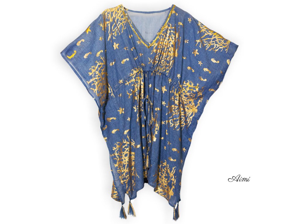 Nomád Sari - Kaftan Ručne Maľovaný Dizajn Morskej Modrej a Zlatej Koralovej Farby