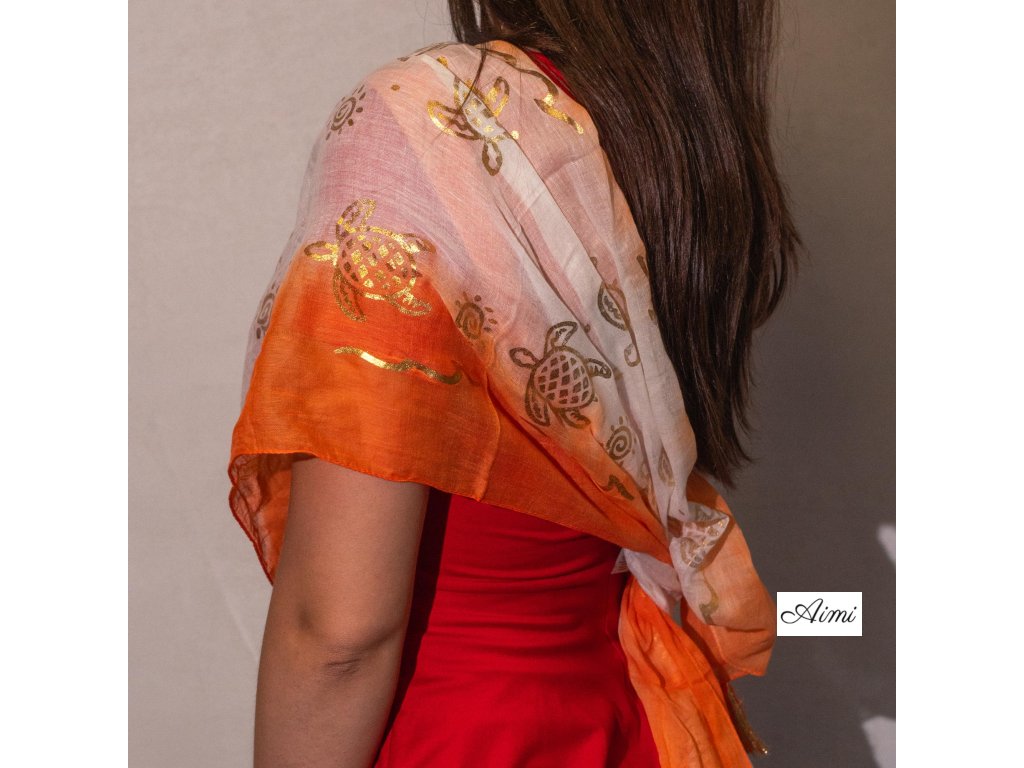 Ručne vyrobený v Indii skúsenými remeselníkmi, zhotovený z mäkkej, ľahkej bavlny, je stvorený na nosenie v teplom počasí. Živý koralový podklad zdobia hravé motívy korytnačiek, ktoré dizajnu dodávajú veselý, no zároveň štýlový charakter. Osloví milovníkov pláže aj tých, ktorí si radi vyberajú veselé a výrazné doplnky.
