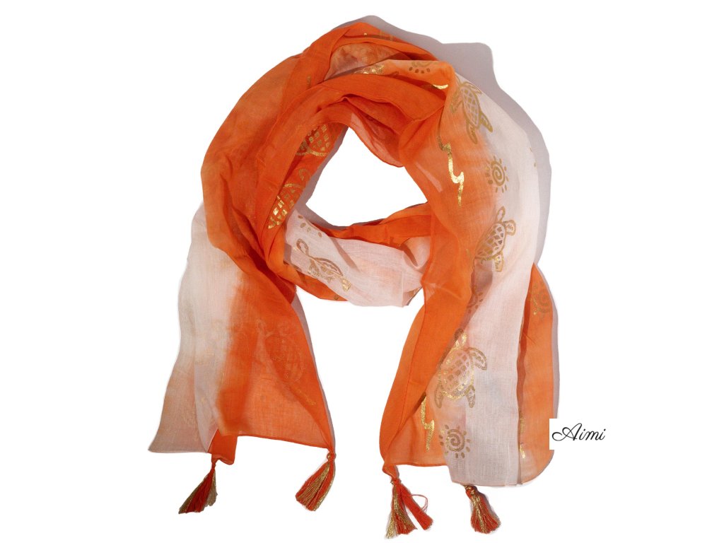 Žiarivý a plný života, tento šál s motívom korytnačiek v teplých koralových tónoch je ideálny na oživenie letnej kolekcie doplnkov.