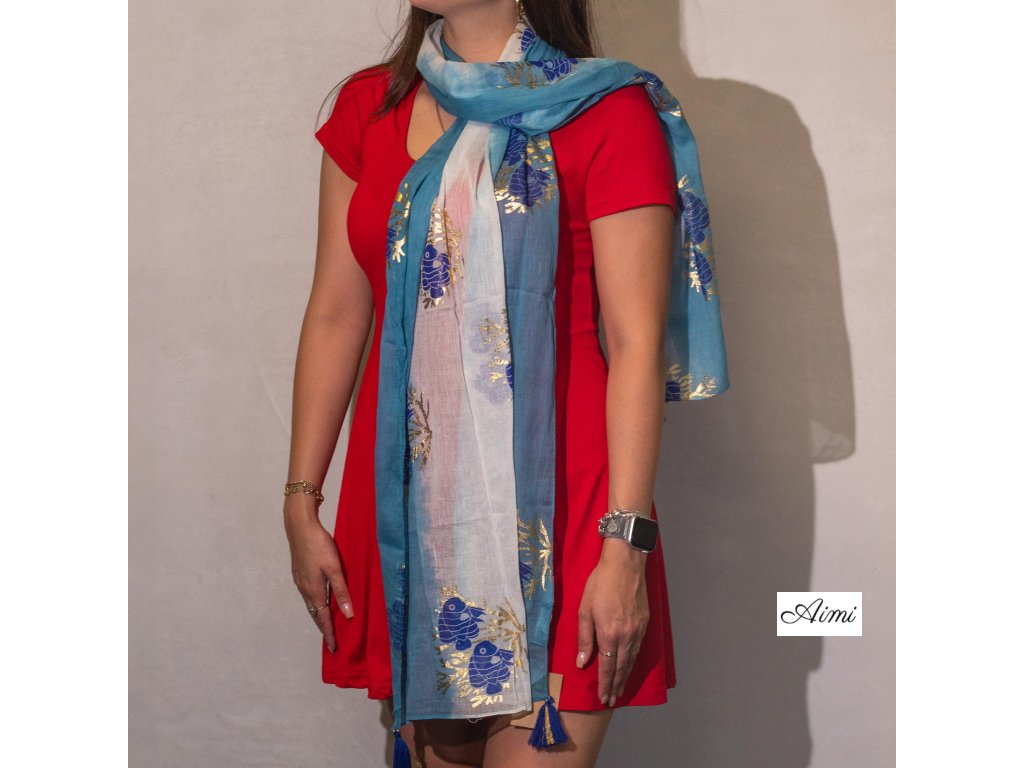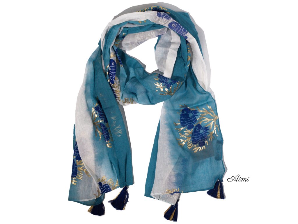 Svieži a ľahký, tento šál s motívom rýb v upokojujúcich morských modrých tónoch prináša čaro prímorského života v nositeľnej podobe.