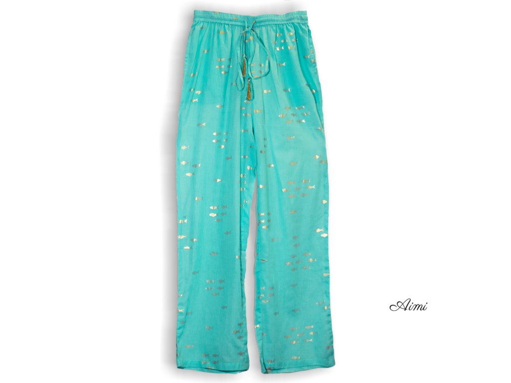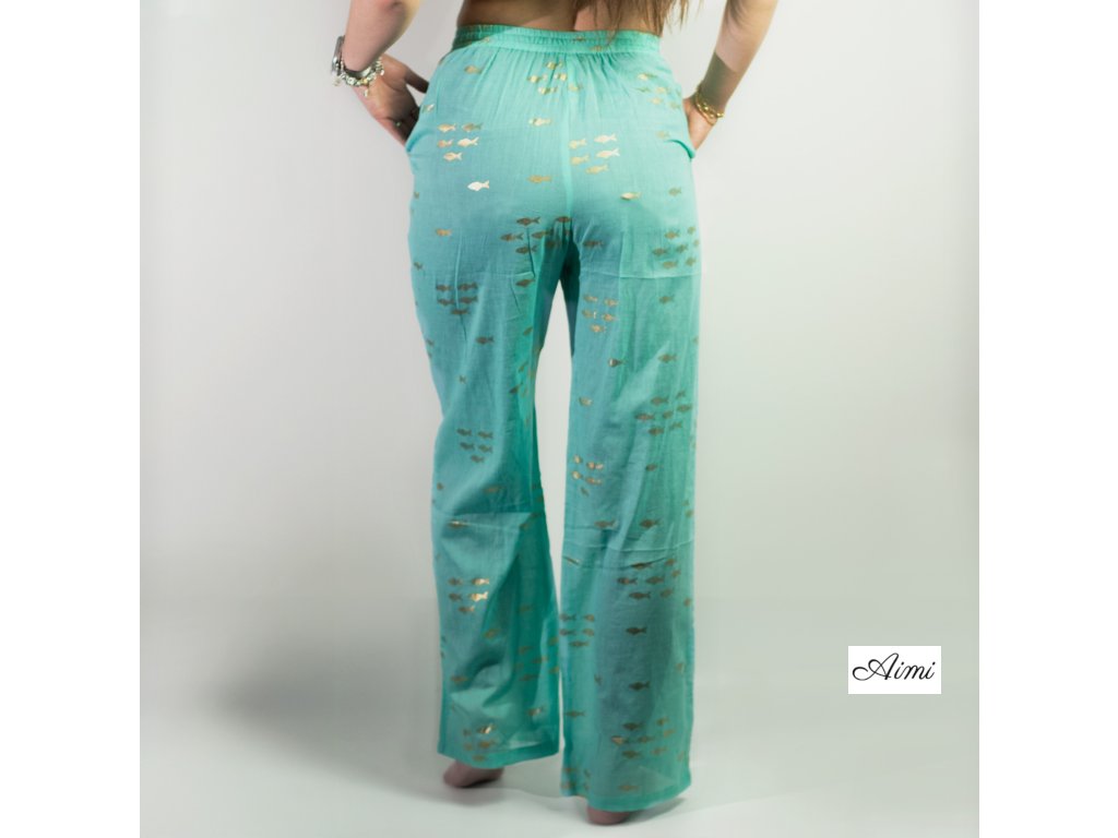 Nomád Sari - Spoločenské Nohavice - Tyrkysová a Zlatá - Design Ryby L/XL