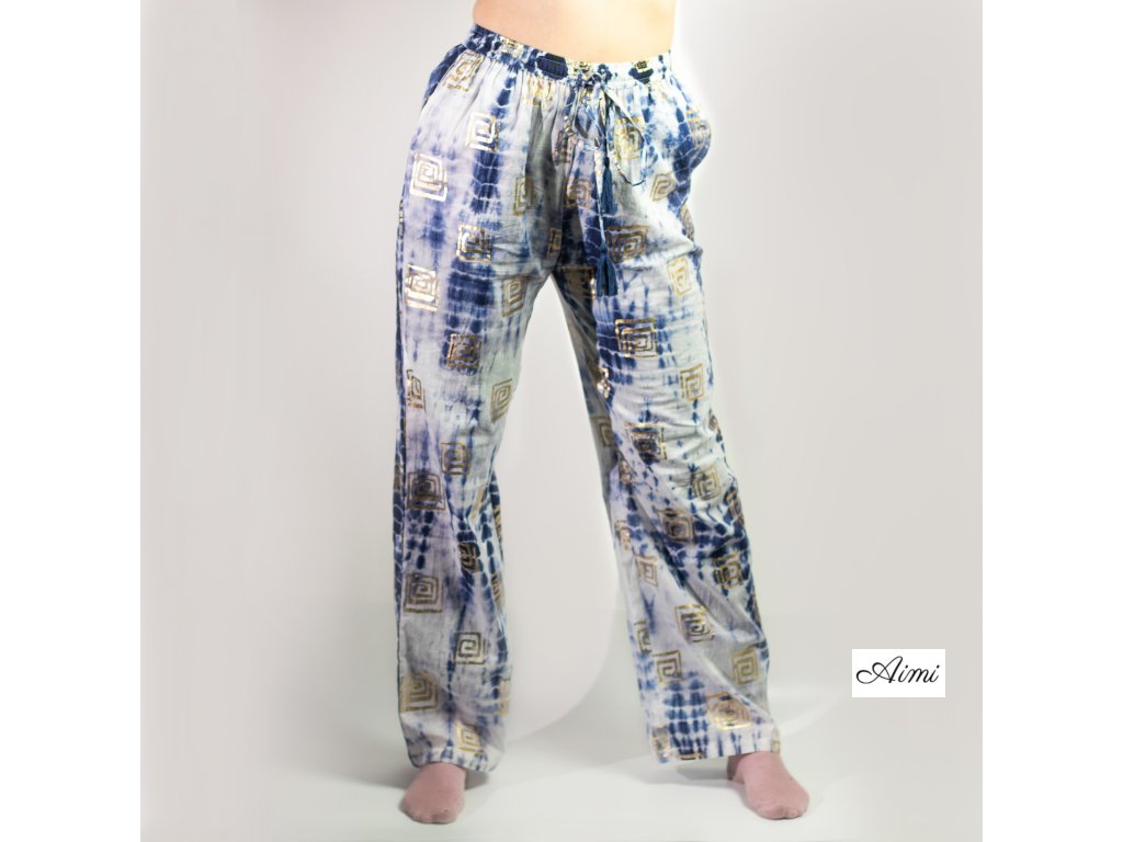 Nomád Sari - Spoločenské Nohavice - Zlatý a Modrý Grécky Motív - Ručne Maľovaný L/XL