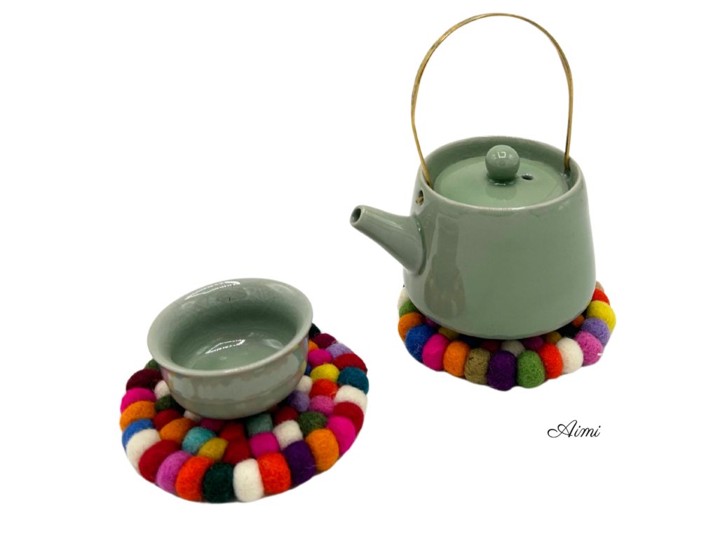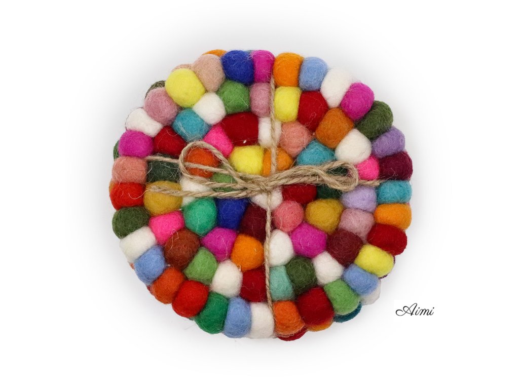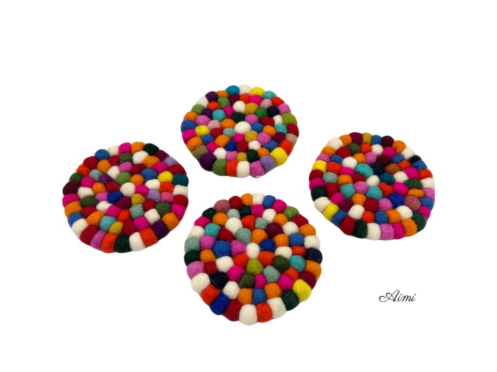 Okrúhle Podložky pod Poháre z Plstených Guľôčok - 10 cm Viacfarebné (sada 4 kusov)