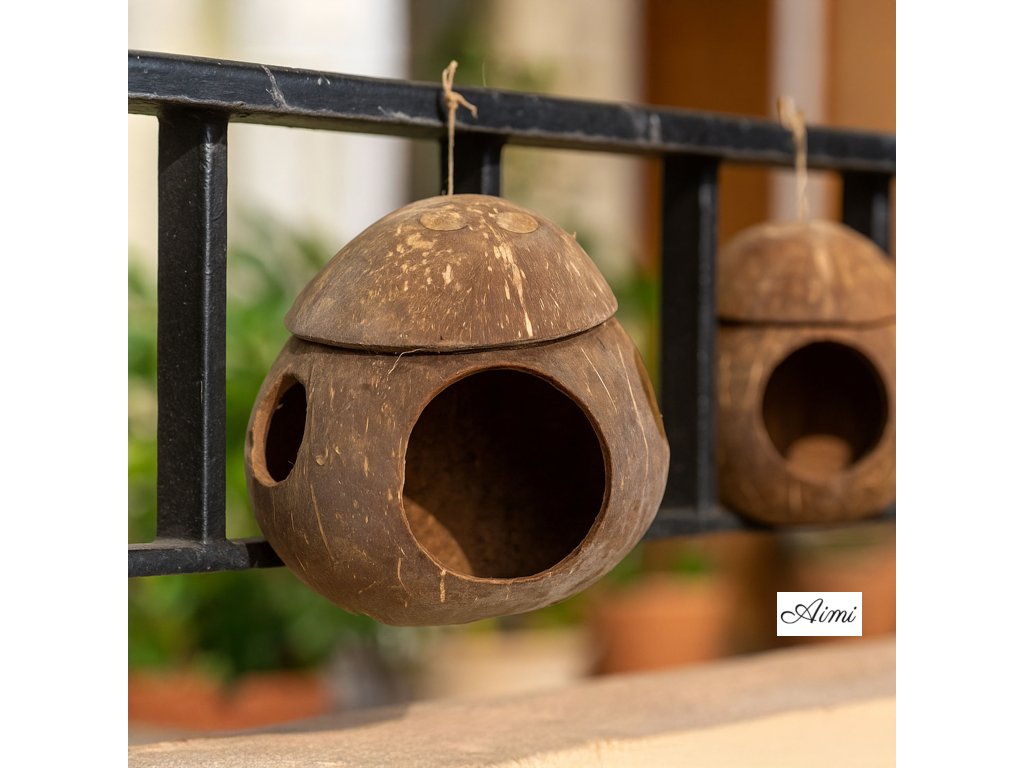 Vneste do svojho sortimentu rustikálny, tropický šarm s týmito prírodnými kokosovými búdkami pre vtáčiky z Indonézie. Sú vybavené pevnou závesnou slučkou pre jednoduché zavesenie, ideálne na balkóny, do záhradných centier alebo do predajných priestorov s prírodnou tematikou. Každá búdka má približne 13 cm a okrúhly vchod – vhodný pre malé vtáčiky alebo ako dekorácia.