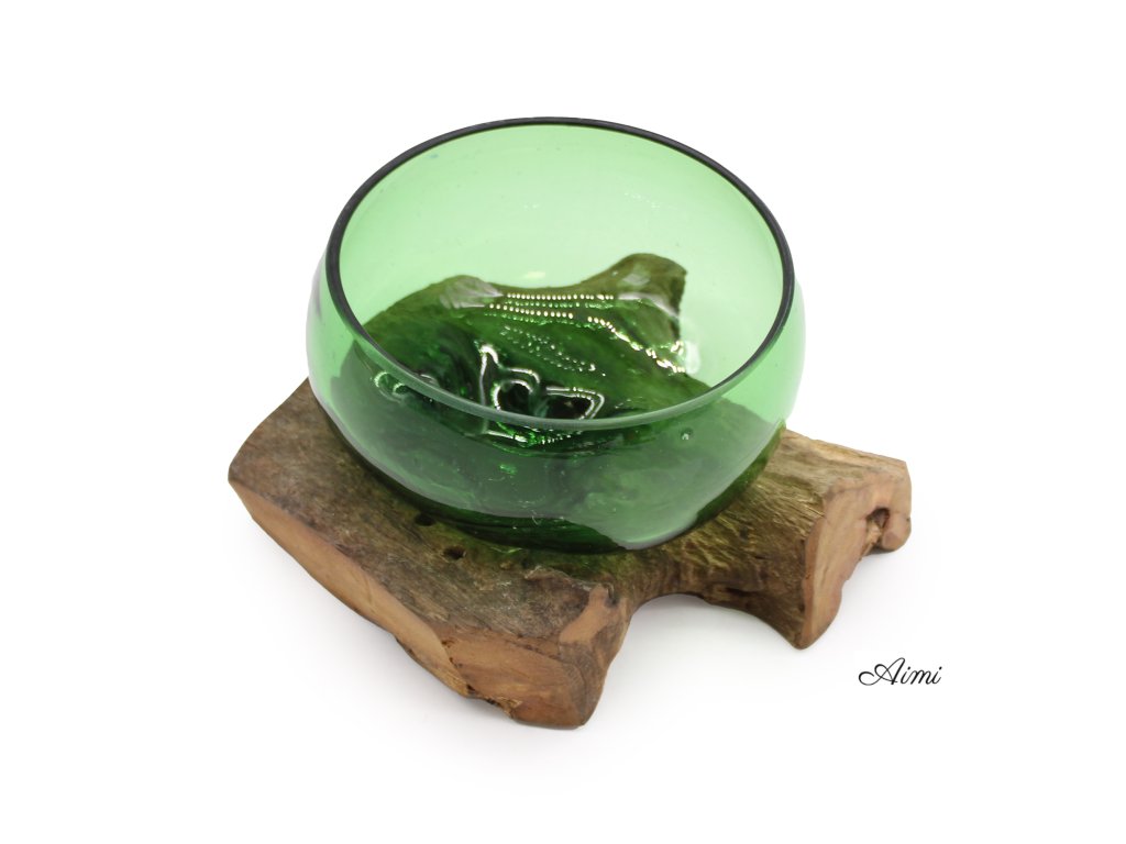 Recyklované Sklo z Pivových Fľiaš - Široká Miska na Dreve