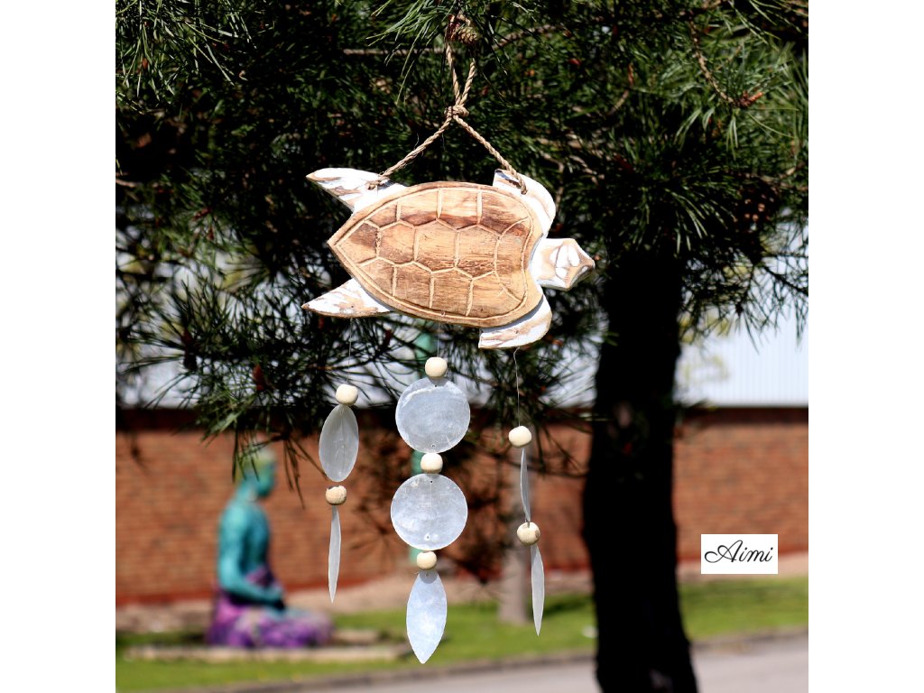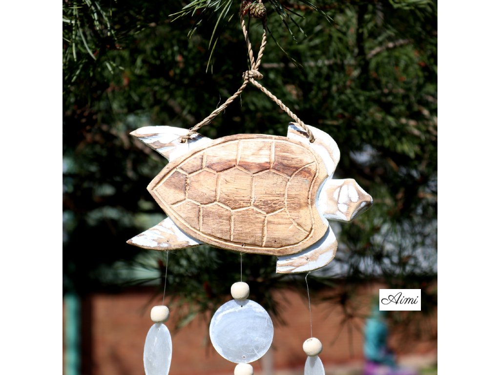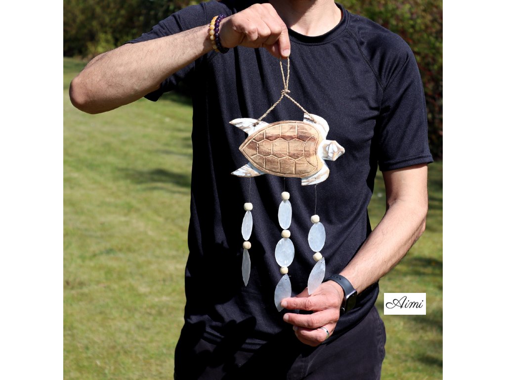 Ručne vyrezávaná korytnačka s jemným bielym náterom sa vznáša nad radom prírodných mušlí capiz, ktoré sa pri dopade denného svetla jemne ligocú. Ľahké mušle pri pohybe vydávajú nežné cinkanie, čím vytvárajú upokojujúcu atmosféru – ideálnu pre tiché kúty, čitateľské zákutia či kryté verandy.