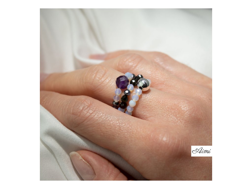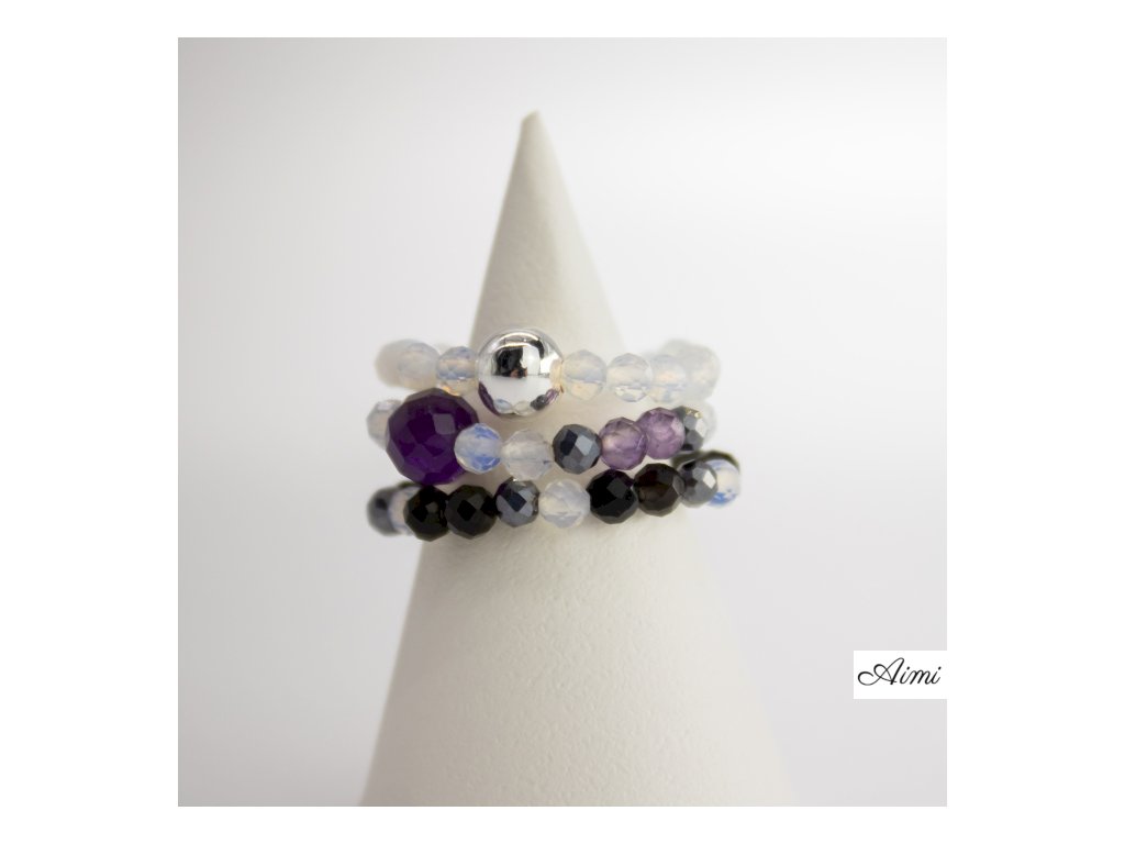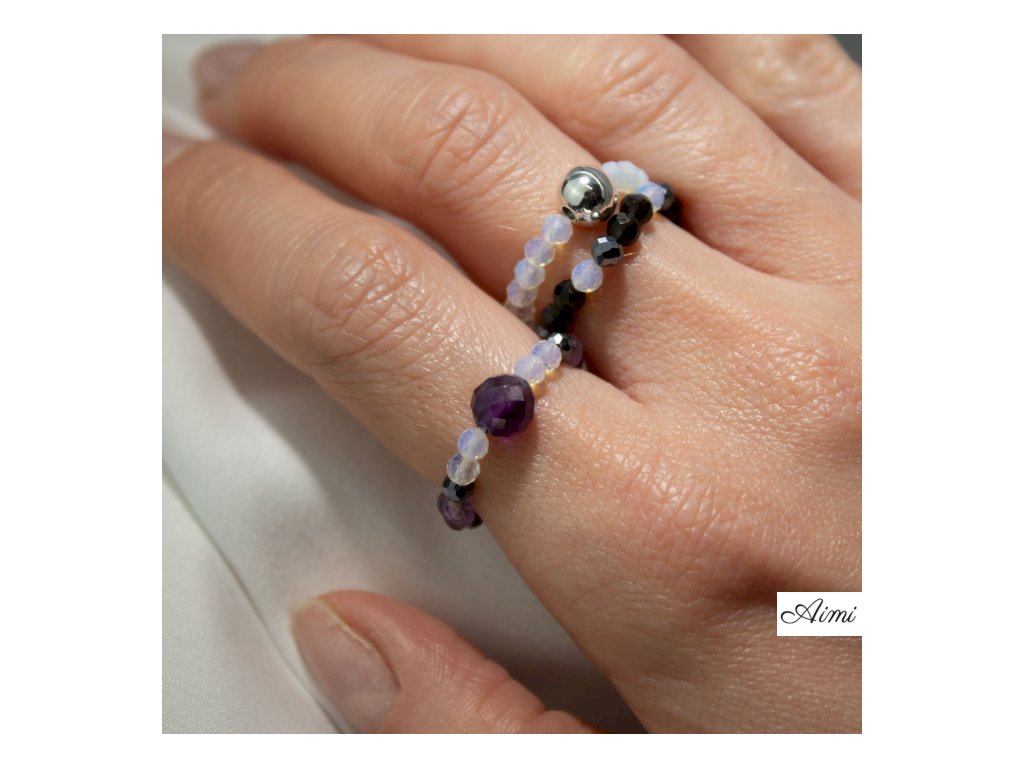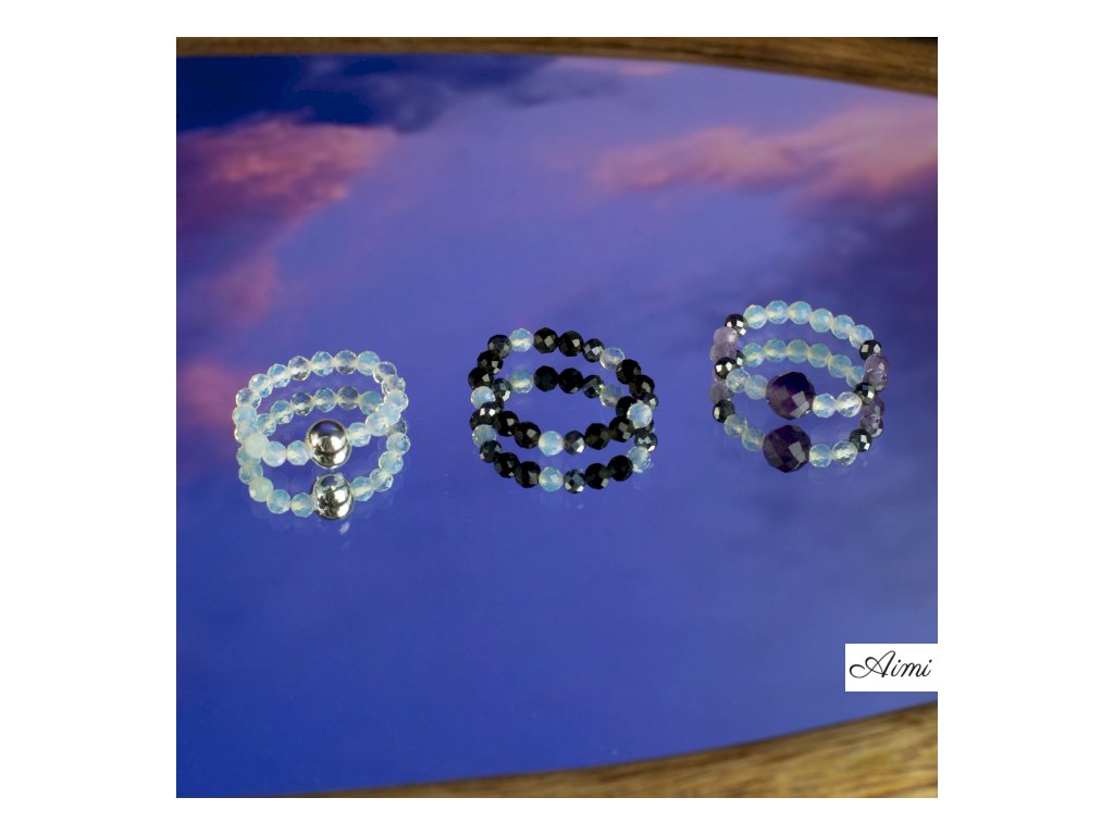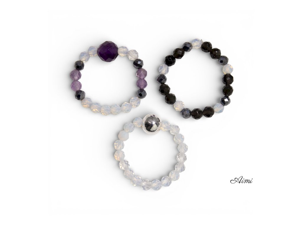Mesačný kameň dodáva jemný, svetelný lesk, obsidián prináša hĺbku a kontrast a ametyst vnáša do setu nežný farebný akcent. Každý prsteň má vlastnú osobitosť, no pri spoločnom nosení vytvárajú vyvážený, nebeský vzhľad.