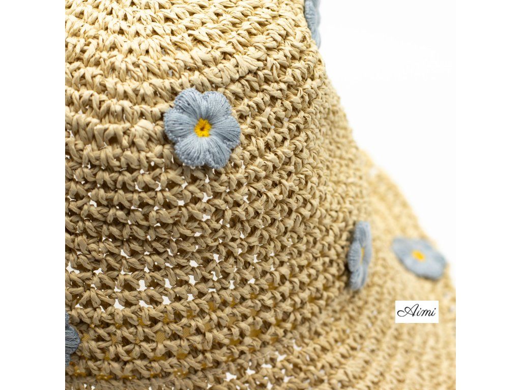 Slamený klobúk Floppy – béžový s modrými kvetmi kombinuje prírodný slamený základ s jemnými kvetinovými detailmi, ktoré vytvárajú ľahký, letný vzhľad. Jemný béžový odtieň robí dizajn univerzálnym, zatiaľ čo malé modré kvety prinášajú nenápadný farebný akcent.