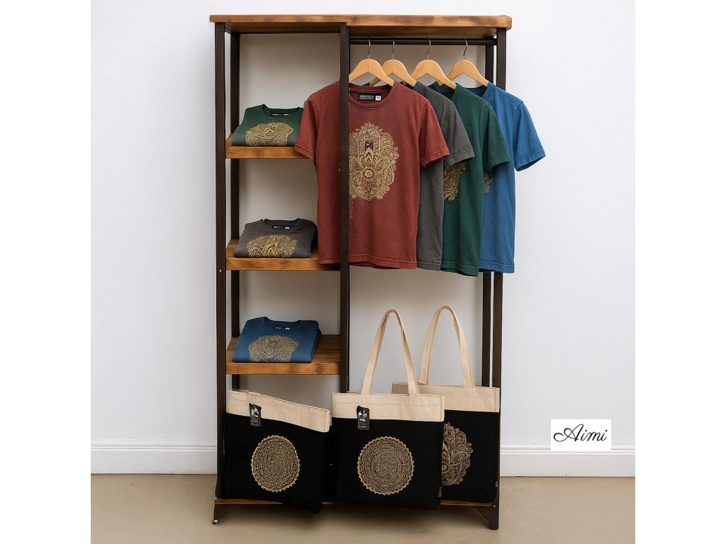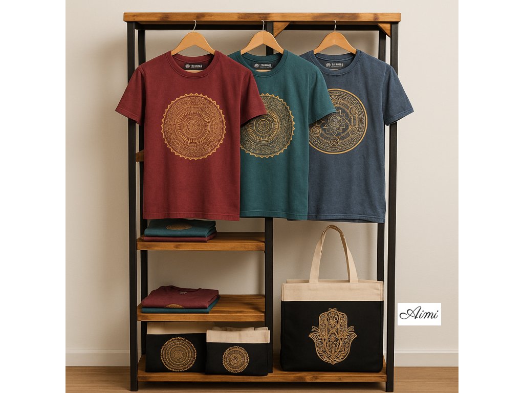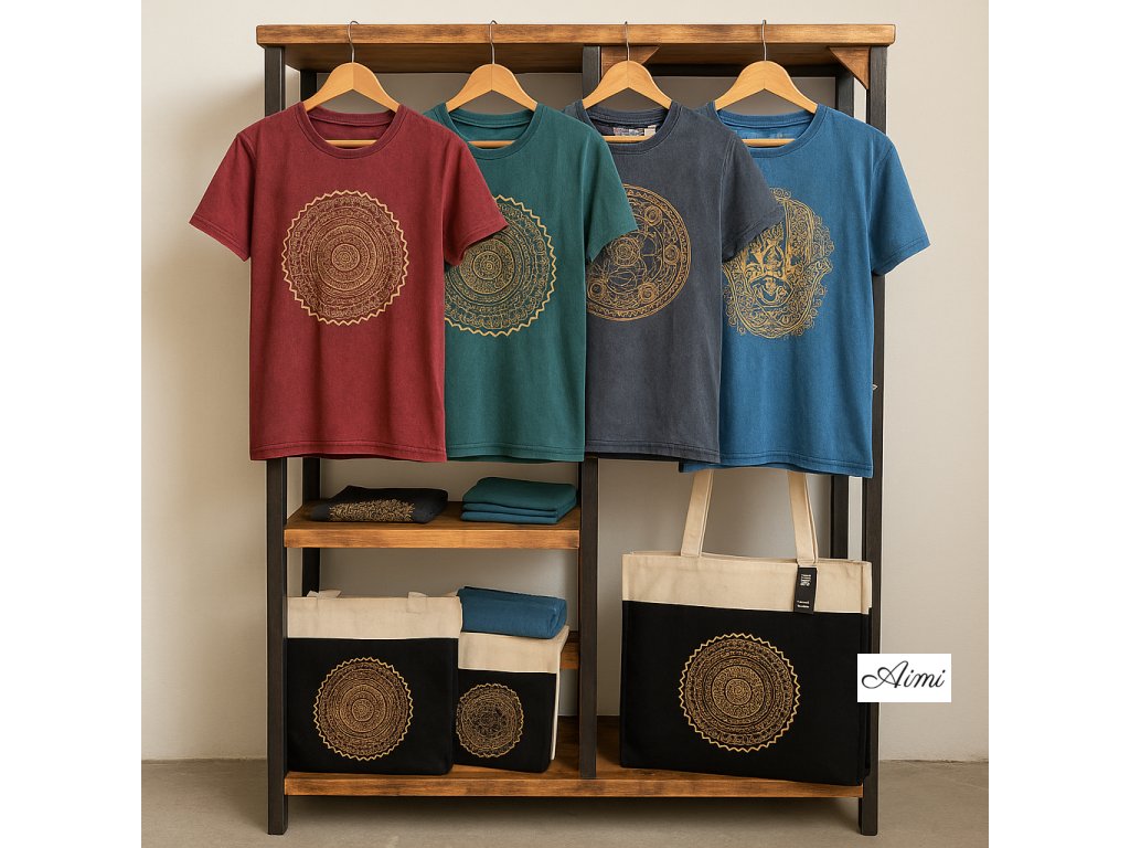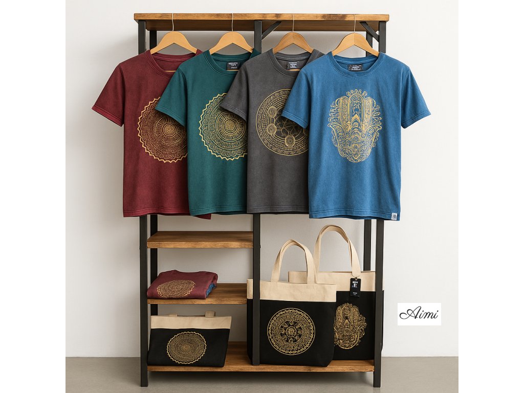 ? Tip: Vystavte tričká spolu so zladenými taškami a vytvorte vizuálne zladený kútik s remeselnou atmosférou. Set je ideálny pre boho butiky, festivalové stánky, ekoshopy alebo predajne s udržateľnou módou.