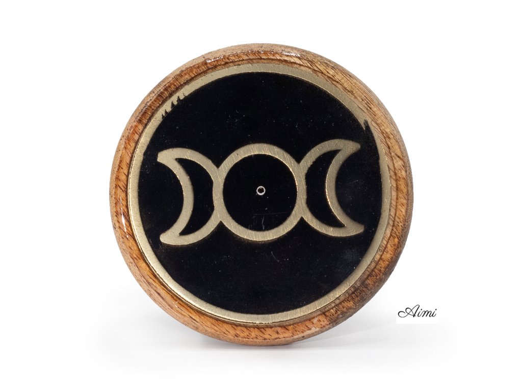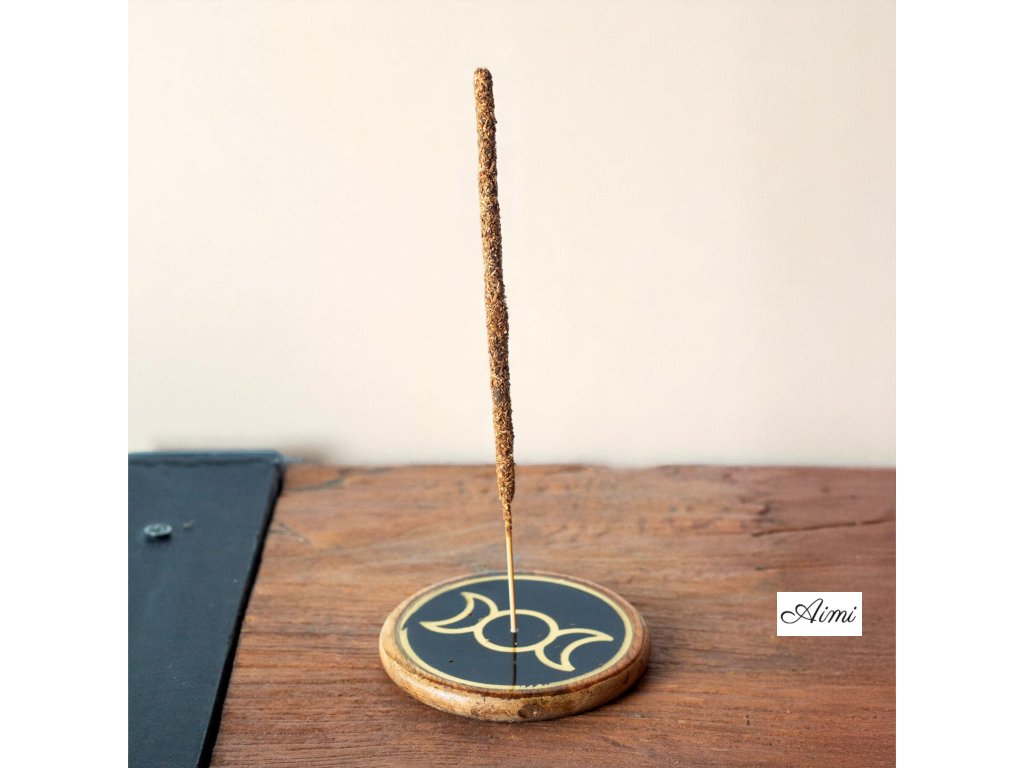 Vyrobené z mangového dreva s výraznou čiernou základňou a zlatým motívom fáz mesiaca, slúžia na uloženie vonných tyčiniek a sú vhodné aj na použitie v kužeľoch. Kompaktný a pútavý predmet na poličky alebo do rituálnych súprav. Približný priemer: 8,5 cm.