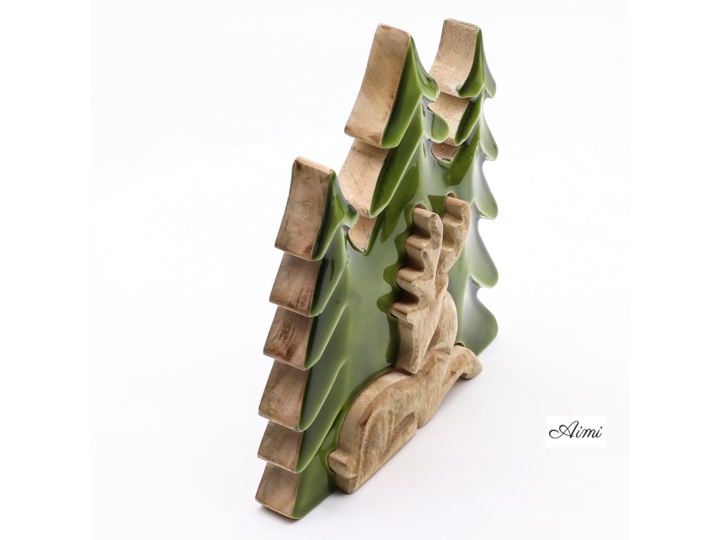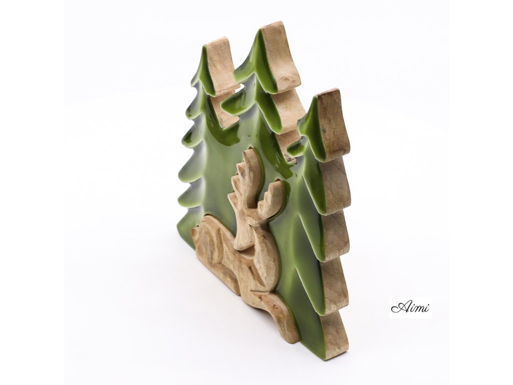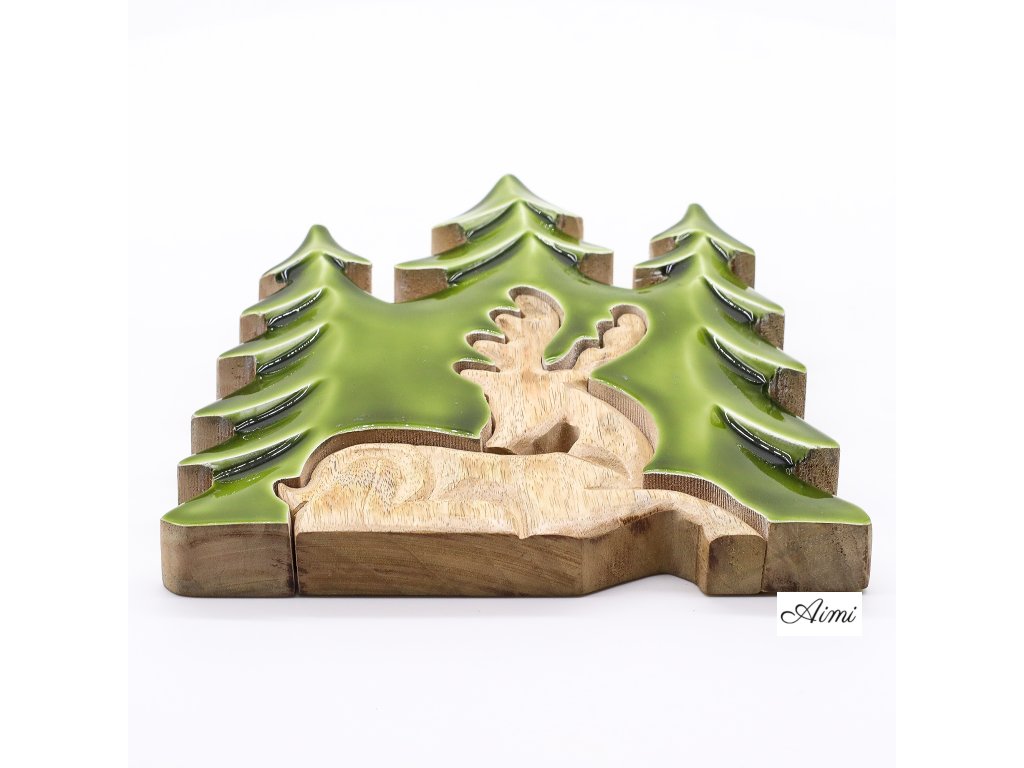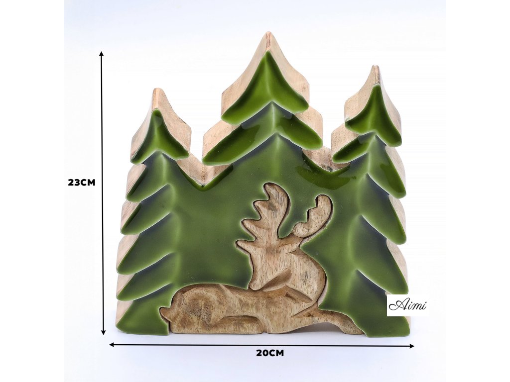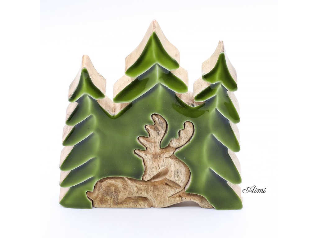 Táto pôsobivá 3D dekorácia „Jeleň v lese“ vystihuje majestátnosť lesnej zveri a prenáša atmosféru prírody priamo do interiéru. Ručne vyrezávaná v Indii z udržateľného mangového dreva, zobrazuje výrazný trojrozmerný motív jeleňa v lesnom prostredí. Povrchová úprava s lesklým smaltom zvýrazňuje rustikálnu štruktúru a sýtozelené akcenty, čím vytvára dojem hĺbky a pokoja.