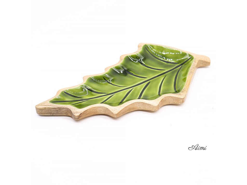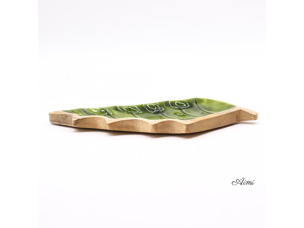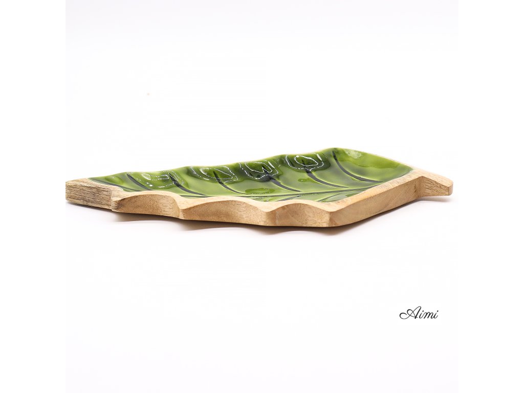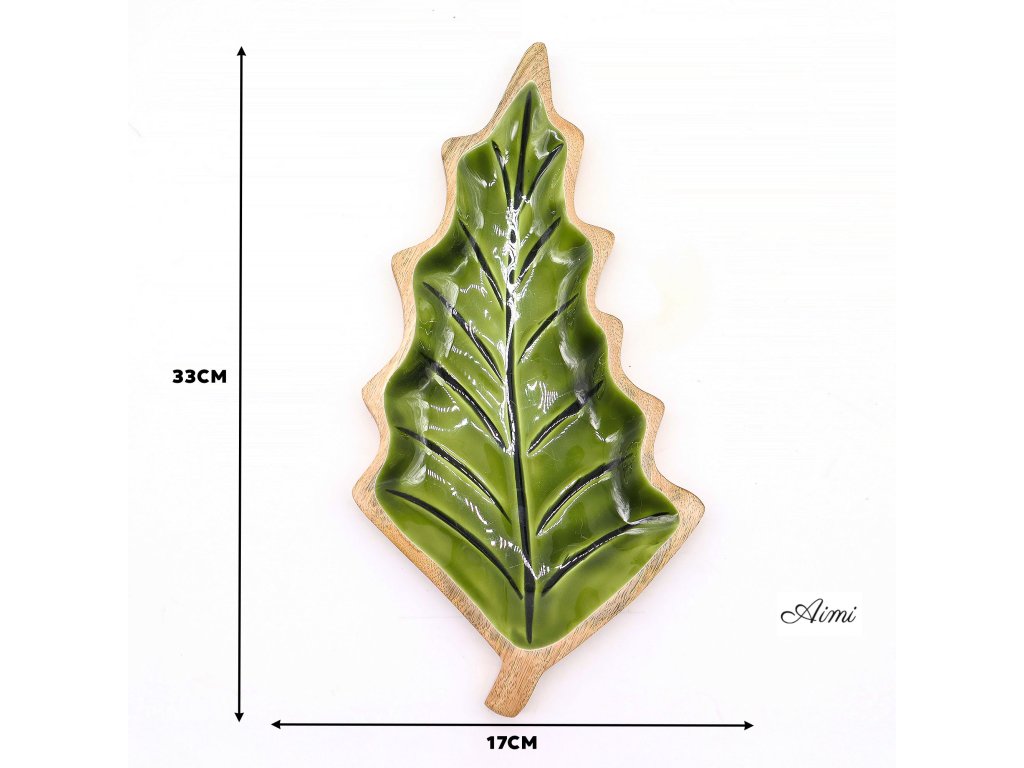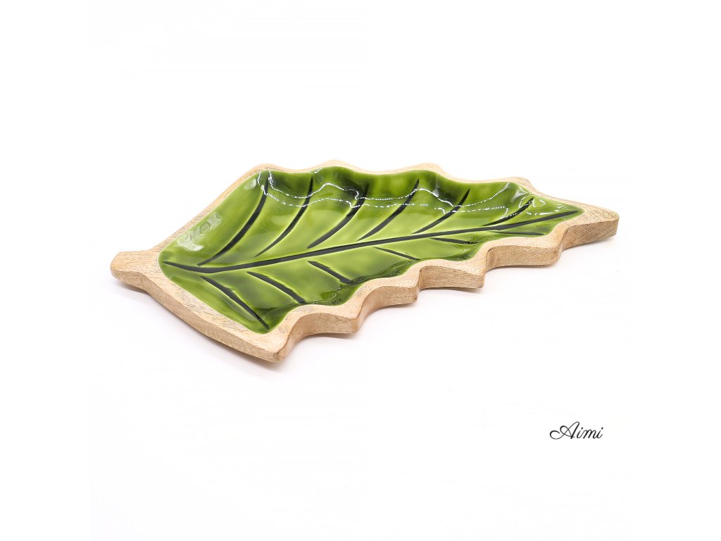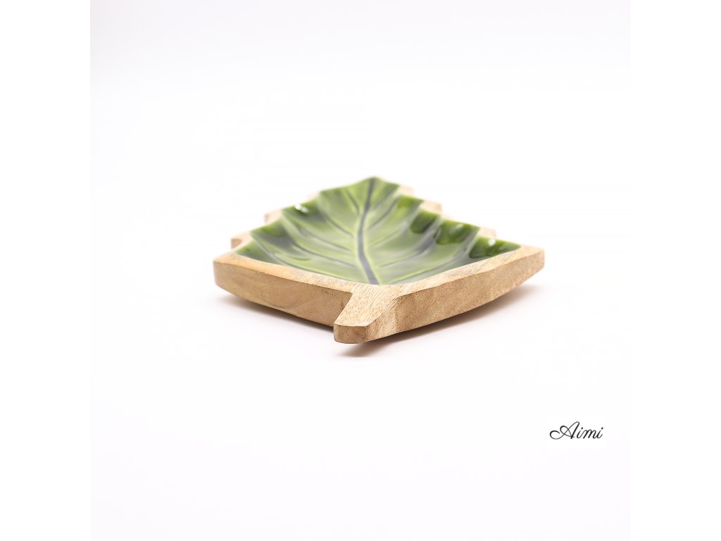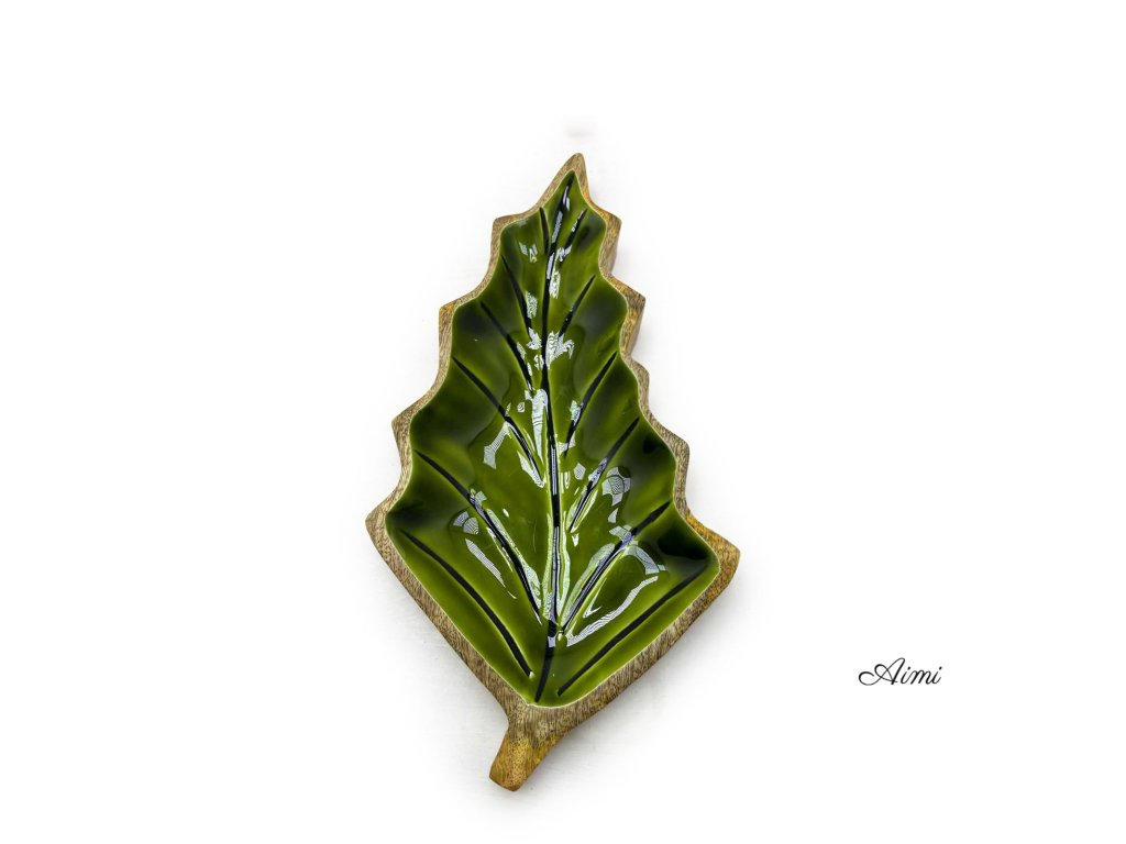 Táto výrazná miska v tvare listu je praktickým aj dekoratívnym doplnkom, ktorý vnesie do priestoru príjemný nádych lesa. Ručne vyrezávaná v Indii z udržateľného mangového dreva, zaujme elegantným tvarom listu. Vnútro misky je upravené lesklým zeleným smaltom, ktorý vytvára pôsobivý kontrast k prírodnému drevu a dodáva produktu svieži vzhľad.