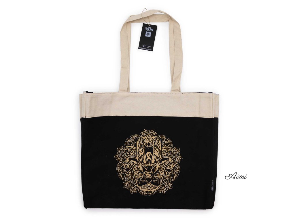 Zlatá potlač zobrazuje Hamsu v prepracovanom kvetinovom štýle, ktorý spája eleganciu so svätou geometriou. Tento talizman osloví zákazníkov hľadajúcich produkty s kultúrnym významom. Vďaka odolnej konštrukcii a priestrannému vnútornému priestoru je taška ideálna ako nákupná taška, plážová taška alebo každodenný spoločník.