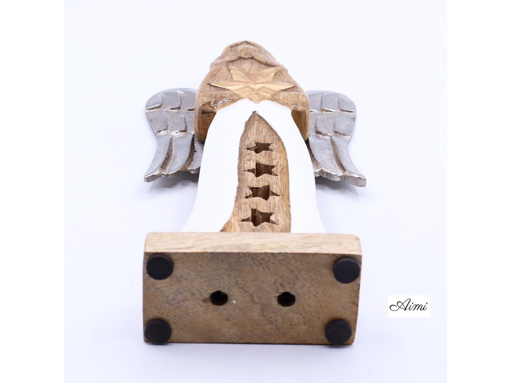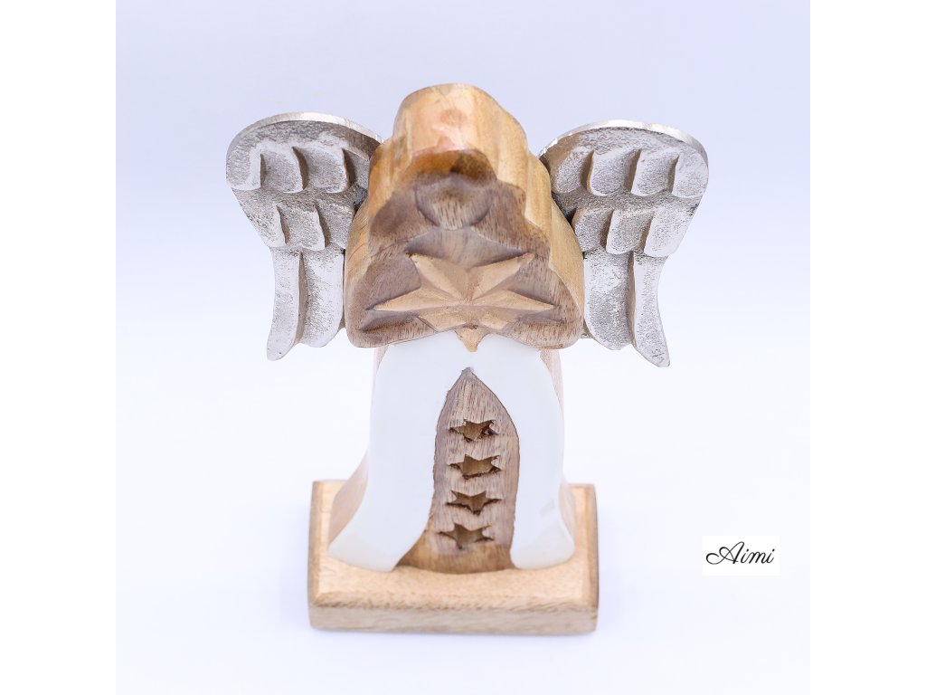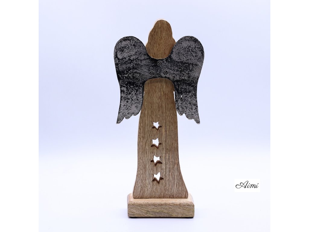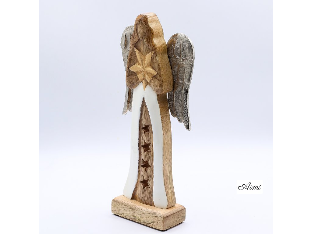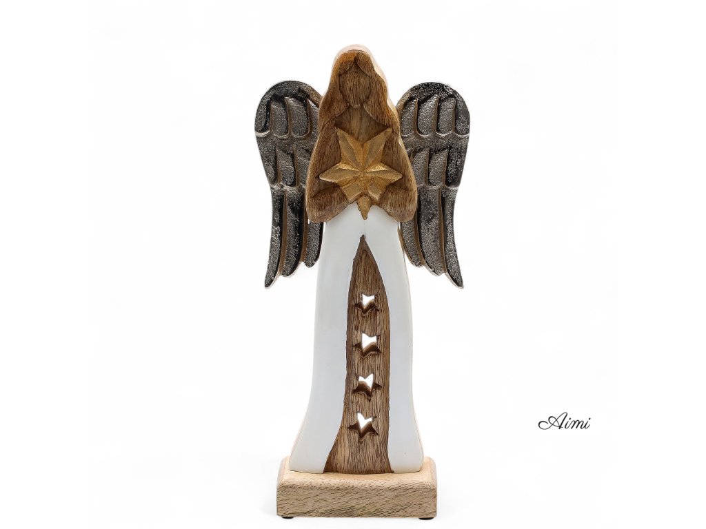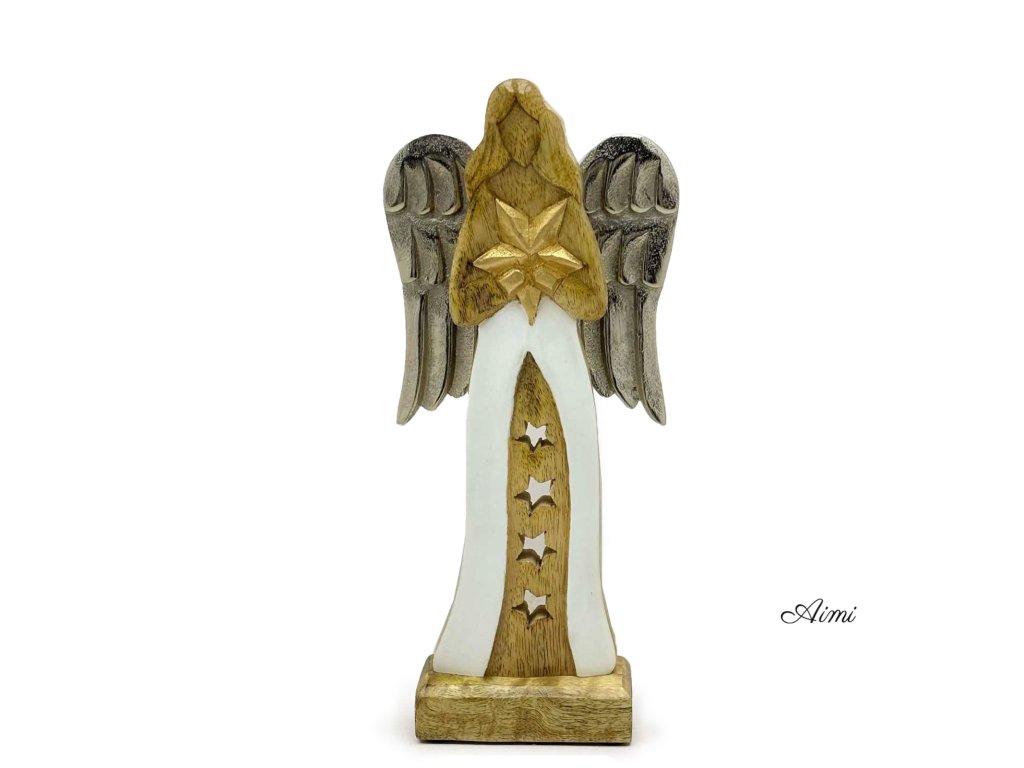Veľký anjel s hviezdou z mangového dreva – kovové krídla a smaltové detaily, 30 cm