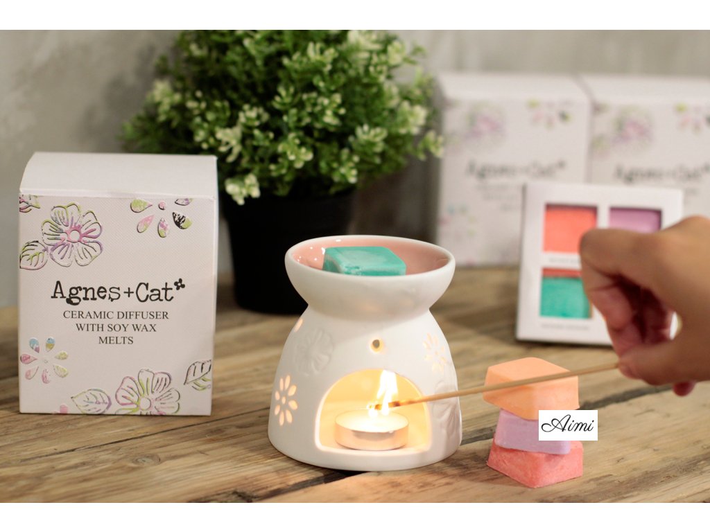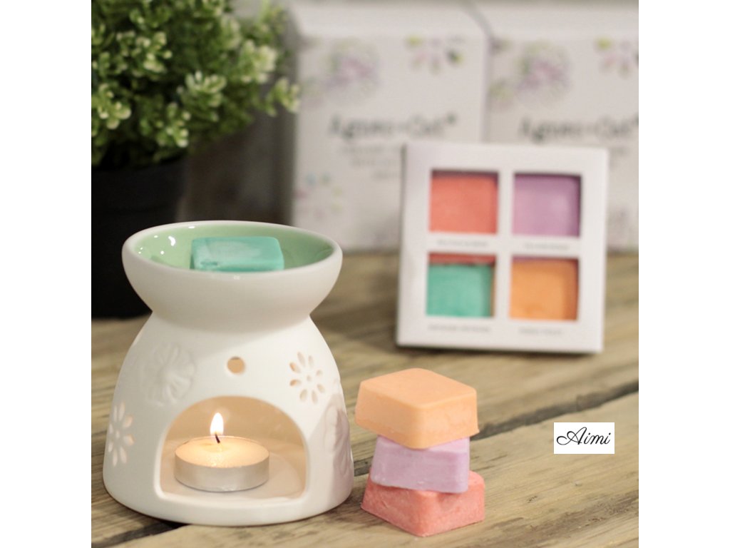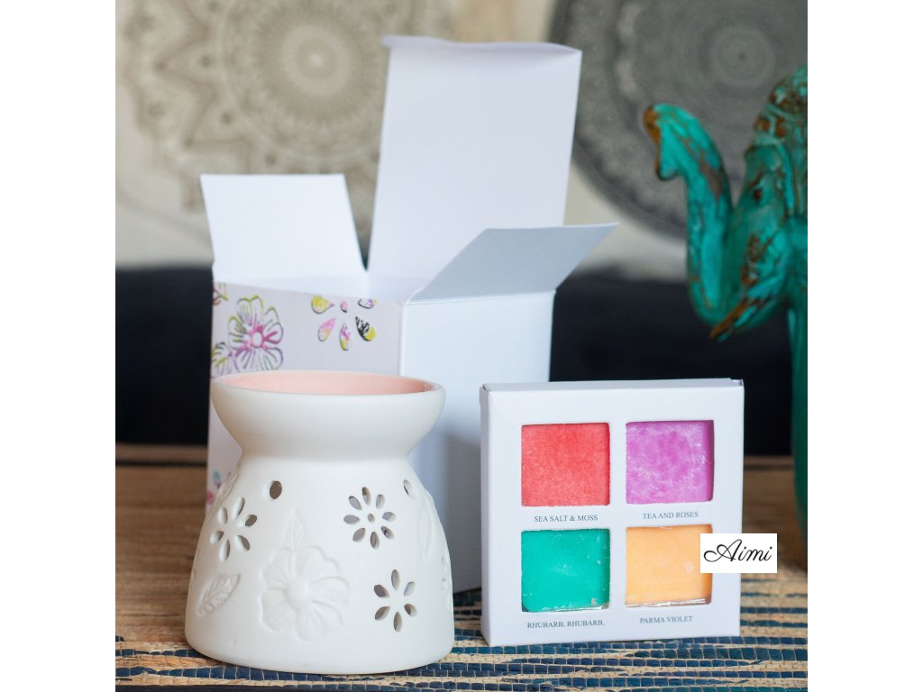 Každá aroma lampa sa dodáva so 4 kockami sójového vosku: morská soľ a mach, čaj a ruže, rebarbora a parmská fialka. Dostupné v dvoch farbách: ružová a zelená.