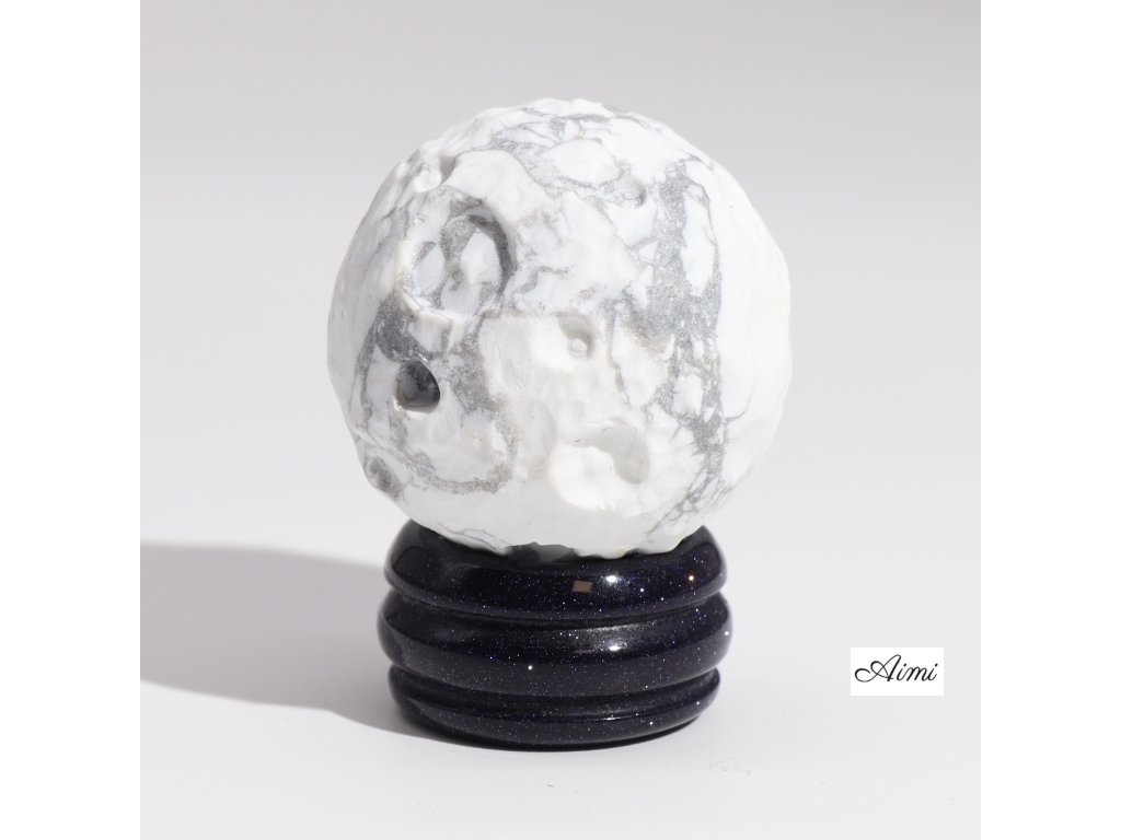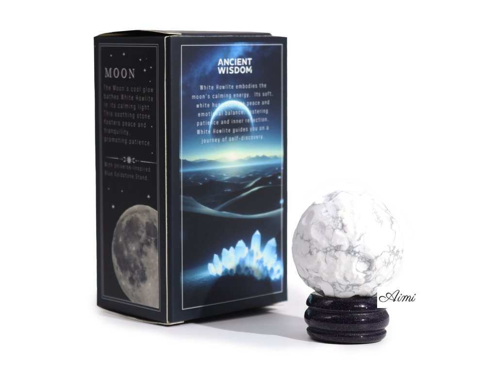 Stojan zo zlatého kameňa, inšpirovaný kozmickými hlbinami, poskytuje uzemňovaciu základňu pre guľu Bieleho Howlitu.