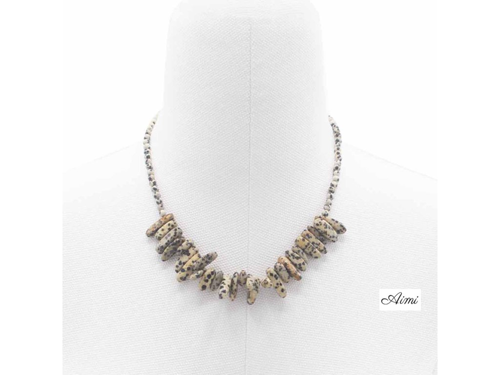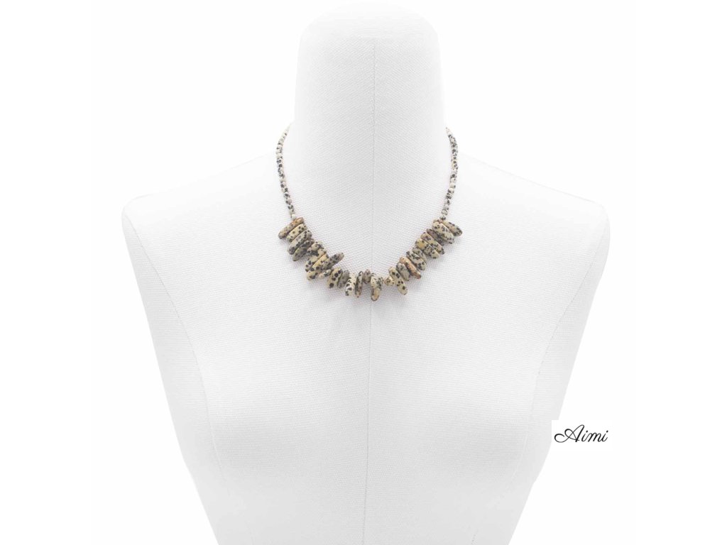Uvoľnite svojho vnútorného divokého ducha s naším náhrdelníkom z dalmatínskeho kameňa. Podlhovastý drahokam dalmatínskeho kameňa, zdobený kaskádou menších, okrúhlych dalmatínskych kameňov, odzrkadľuje hravé miesta dalmatínskeho psa a dodáva energiu a radosť do vášho súboru.