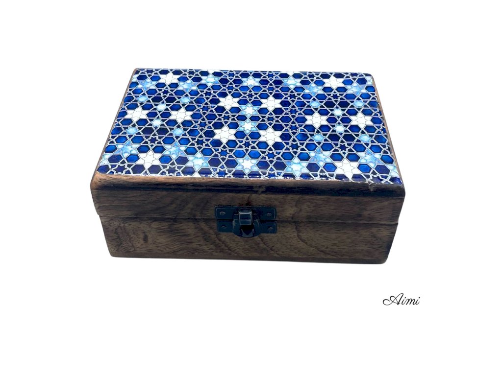 Stredná Drevená Krabička s Keramickou Glazúrou - 15x10x6cm - Modré Hviezdy