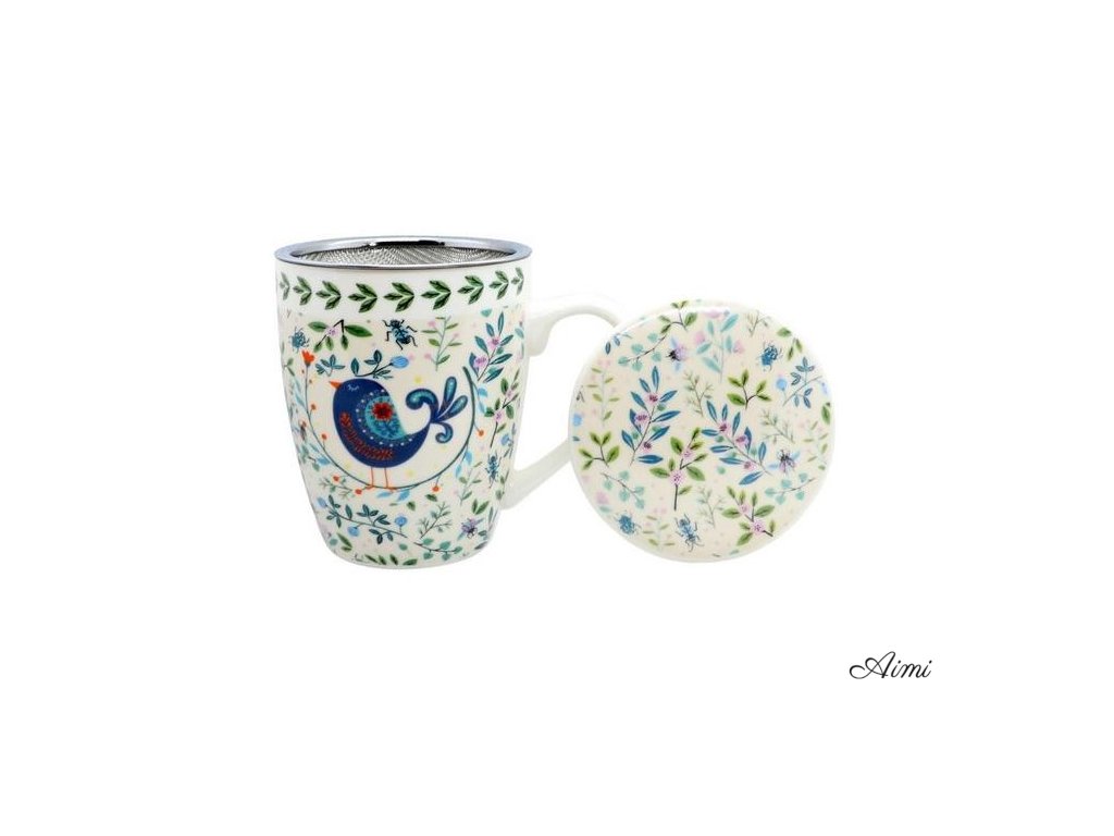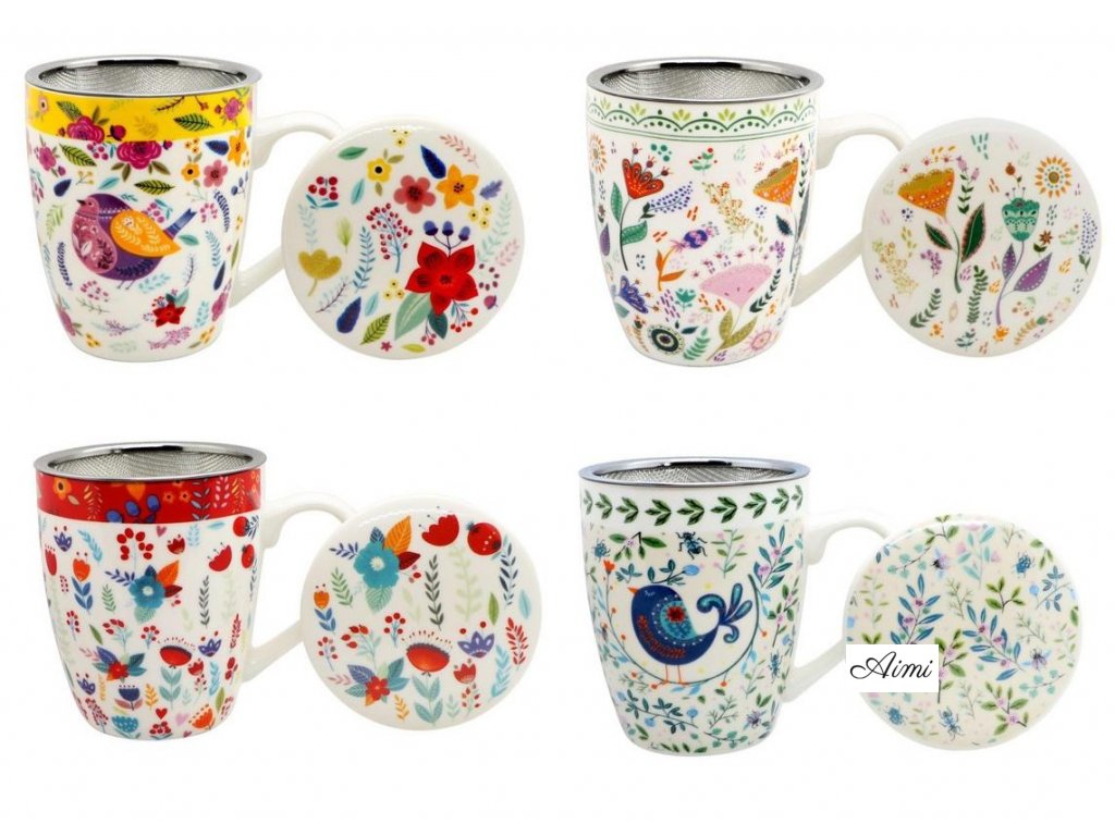 Hrnček s kovovým sitkom na sypaný čaj porcelán 360ml s ĽUDOVÝM motívom KVIETKY pestrý