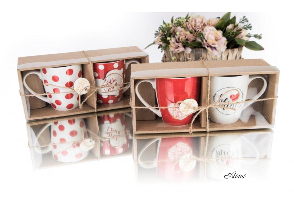 Hrnček červený SADA 2ks Bodkovaný SRDCE 360 ml balené v darčekovej krabičke Mix vzorov