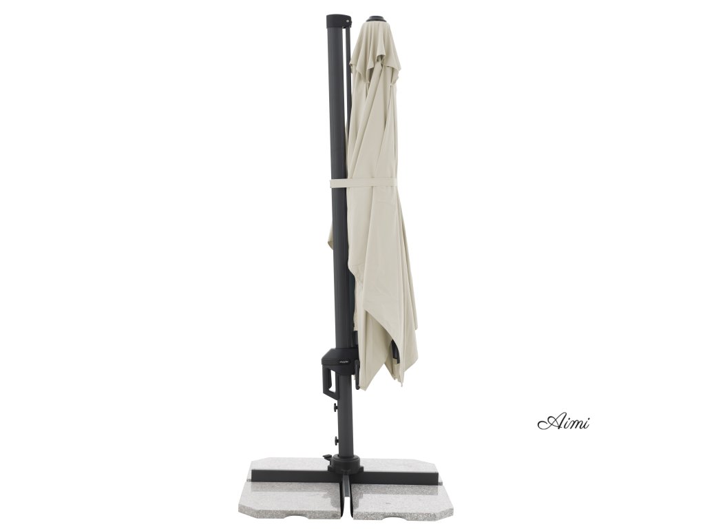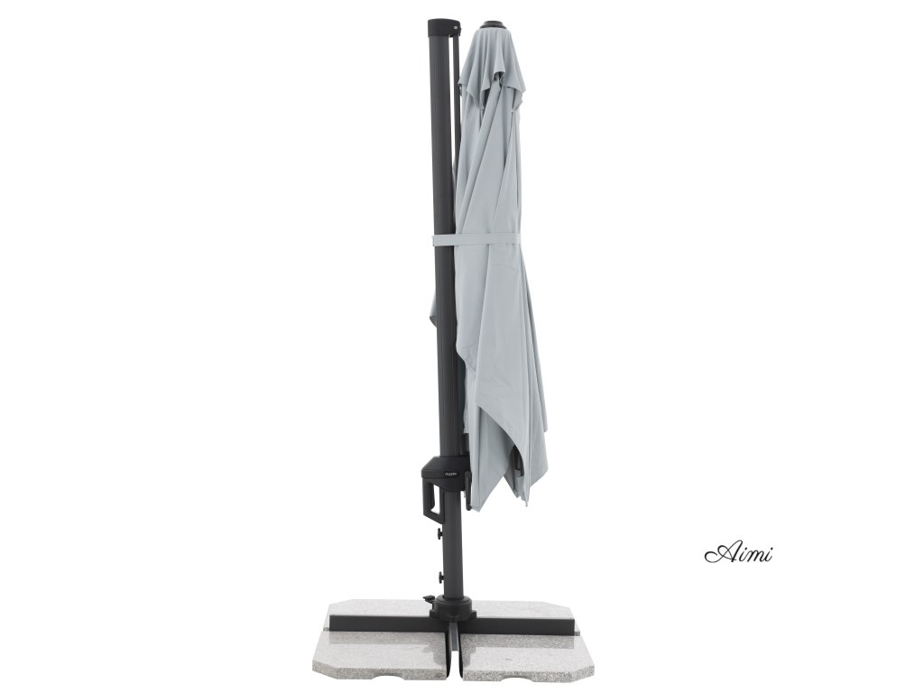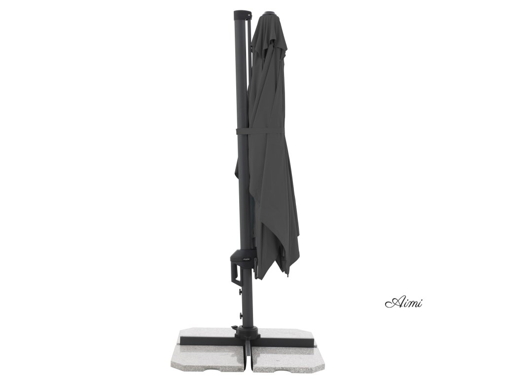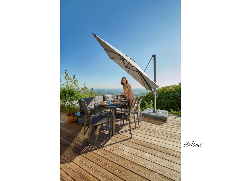 Moderný slnečník s hliníkovou konštrukciou v antracitovej farbe je ideálny na balkón alebo terasu. Jednoduché a pohodlné otvorenie a zatvorenie slnečníka vďaka kľučkovému mechanizmu. Dá sa prispôsobiť pohybu slnka počas dňa, otáča sa o 360 °, naklápa sa axiálne na obe strany a môže byť nastavený pod uhlom dozadu a tak sa optimálne prispôsobuje pohybu slnka. Poťah je vyrobený zo 100procent PET recyklovanej polyesterovej tkaniny a má UV ochranu 50 plus . Touto novou kolekciou „GREEN EDITION“ nasledujeme trend udržateľnosti materiálov a výrobkov.