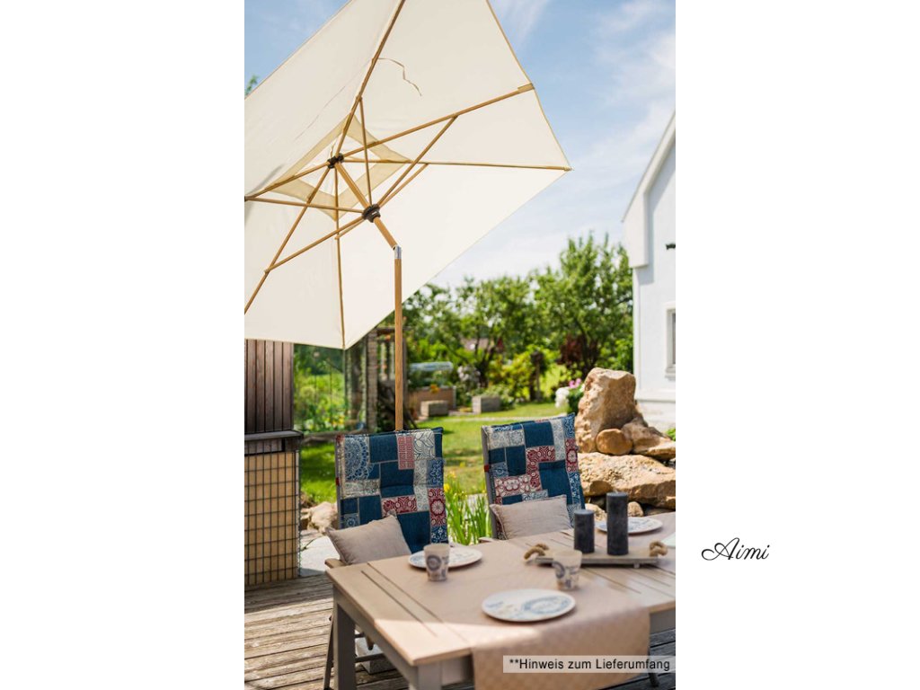 ALU WOOD 210 x 140 cm - slnečník s automatickým naklápaním s ULTRA UV ochranou Tento slnečník urobí radosť milovníkom dreva. Vďaka nadčasovému vzhľadu v imitácii jaseňového dreva a poťahom v teplých prírodných farbách, sa hodí takmer na každý balkón, terasu alebo záhradu. Slnečník ponúka užívateľsky prívetivú prevádzku, obsluha pomocou kľučky. Slnečník má možnosť výškového nastavenia o 15 cm. Rám slnečníka je vyrobený z vysoko kvalitného hliníka a vzpery z ocele, čo umožňuje dlhú životnosť. Poťah má vynikajúcu ochranu proti UV žiareniu 80 plus . Vďaka ventilačnému otvoru v streche sa pod slnečníkom nekumuluje horúci letný vzduch. Informácie o produkte: veľkosť slnečníka cca 210 x 140 cm obdĺžnikový tvar strechy odporúčané zaťaženie najmenej 40 kg podchádzajúca výška: cca 195 cm celková výška otvoreného slnečníka: cca 233 cm veľkosť balenia: cca 13,5 x 13,5 x 154 cm váha balenia: cca 5,1 kg Rám: priemer tyče: 35/38 mm hliníkový rám v imitácii jaseňového dreva, práškový nástrek oceľové vzpery v imitácii jaseňového dreva, práškový nástrek jednoduchá obsluha pomocou kľučky možnosť naklopenia na obe strany Poťah: 100procent polyesterová tkanina 180 g/m2 SPF 80 plus stálofarebnosť 5 plus odolný voči dažďu poťah je k dispozícii v rôznych farbách