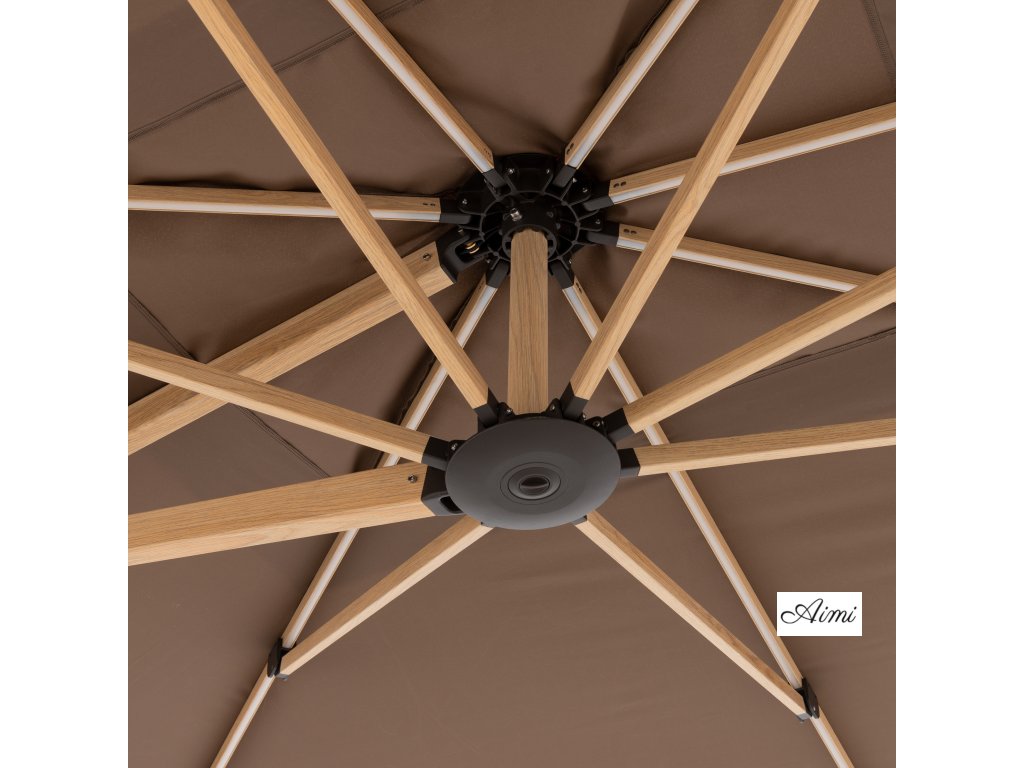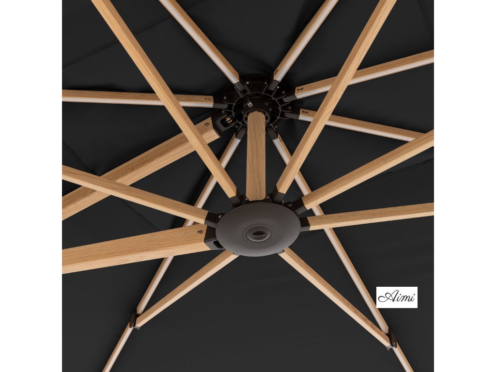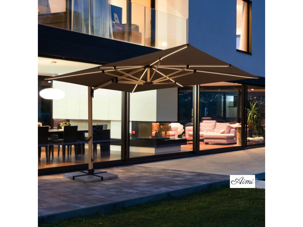 Slnečník Alu Wood 400 x 300 cm Väčšie a robustnejšie záhradné slnečníky u nás naozaj nenájdete. Tento úplný elegantný unikát v sekcii Doppler záhradných slnečníkov s bočnou nohou spĺňa všetky požiadavky, ktoré má slnečník svojmu užívateľovi poskytnúť. Výnimočná plocha strechy, robustná konštrukcia a masívne oceľové ramená, ktoré sú navyše osadené LED svetelnými pásiky, u ktorých je možné nastaviť silu svitu, zaručí absolútny komfort. Slnečník možno otáčať okolo svojej osi o 360 ° a strechu možno posunom po hlavnej tyči naklopiť a fixovať v niekoľkých pozíciách. Presne tak, ako si prajete nastaviť tieň v danú dennú dobu. Napriek tomu, že je Alu Wood XL taký gigant, jeho obsluha je veľmi jednoduchá. Otváranie a zatváranie funguje pomocou kľuky, otáčanie okolo svojej osi pomocou nášľapného pedálu. Samozrejmosťou je kvalitný poťah zo 100procent polyesteru, ktorý je odolný poveternostným vplyvom, má veľmi dobrú UV ochranu pred slnečným žiarením a dobrú stálofarebnosť 5 plus . Konštrukcia je z hliníka, s nadčasovým dizajnom dreva v kombinácii s poťahom v modernej farbe. Informácie o produktu: obdĺžnikový tvar strechy vrátane základného kríža pre dosky s rozmermi 50 x 50 cm (Pozor: dosky musí byť objednané samostatne) odporúčané zaťaženie min. 200 kg podchodzia výška: cca 245 cm celková výška otvoreného slnečníka: cca 277 cm naklápací v mnohých polohách otočný nožným pedálom o 360 ° veľkosť balenia: cca 500 x 300 x 3150 mm váha balenia: cca 73,1 Kg dĺžka svitu: 330 minút pri najvyššom jase Rám: priemer tyče: 105 x 70 mm hliníkový rám oceľové vzpery kľučkový mechanizmus Poťah: 100procent polyester 180 g / m2 SPF 80 plus stálofarebnosť 5 plus odolný poveternostným vplyvom Dôležité info na obsluhu slnečníka: V prípade napájania osvetlenia slnečníka z elektrickej siete je nutné najskôr odpojiť konektor akumulátora. Napájanie slnečníka z elektrickej siete nesmie byť použité súčasne pri napájaní akumulátorom. Ovládanie osvetlenia je možné vykonávať buď bezdrôtovým ovládačom, alebo vypínačom umiestneným spolu s akumulátorom v uzamykateľnom boxe ..