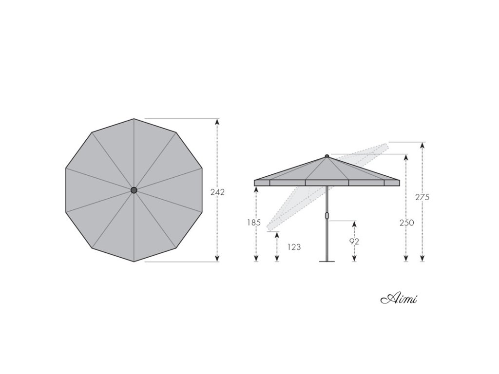 Vlastnosti a funkcie | Otočný okolo osi, Odolné poveternostným vplyvom, Naklápací, S volánom, Vhodné pre Gastro, Výškovo nastaviteľný |
