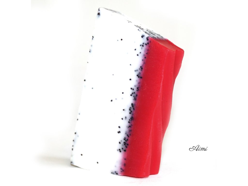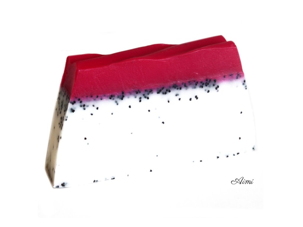 Nádherná mydlová tehla, ktorá má úžasnú vôňu dračieho ovocia naplneného makom, pre prečistenie mŕtvej pokožky a pre hladký a lesklý vzhľad a pocit!