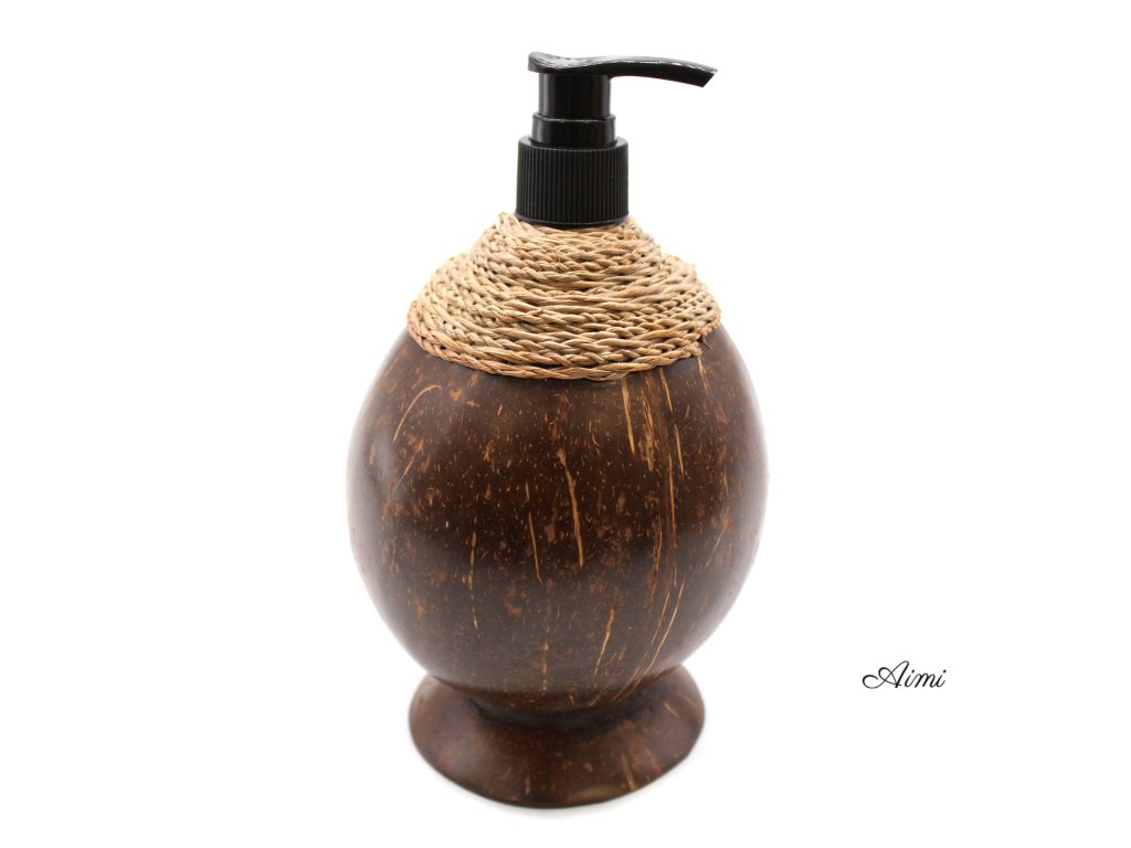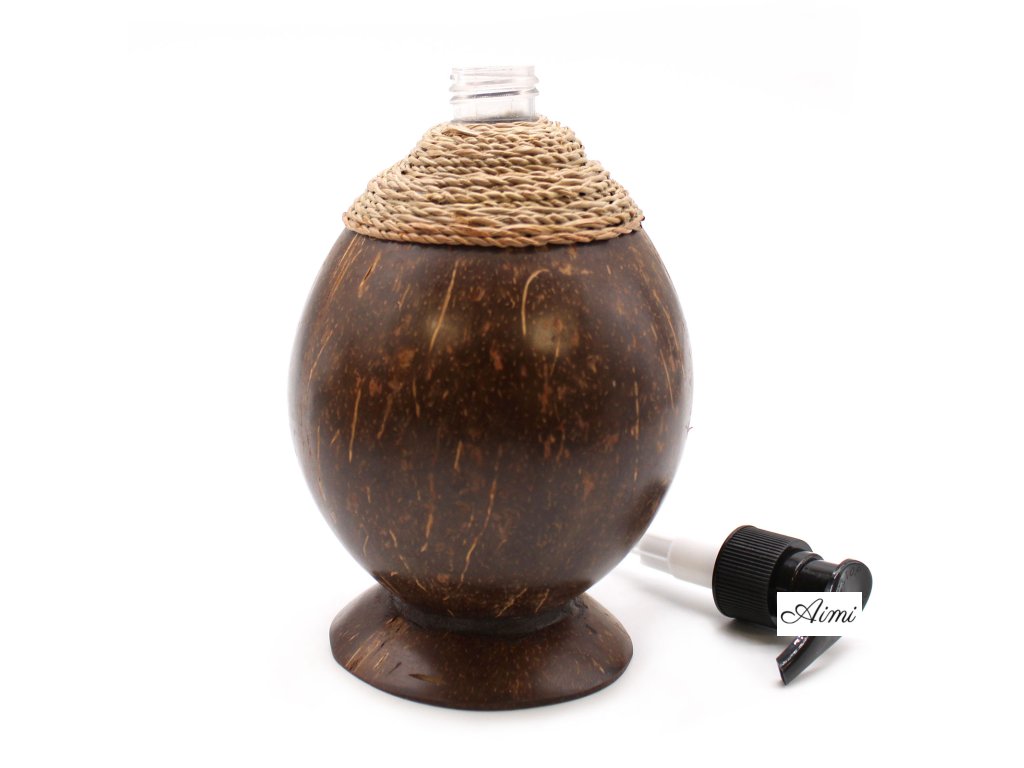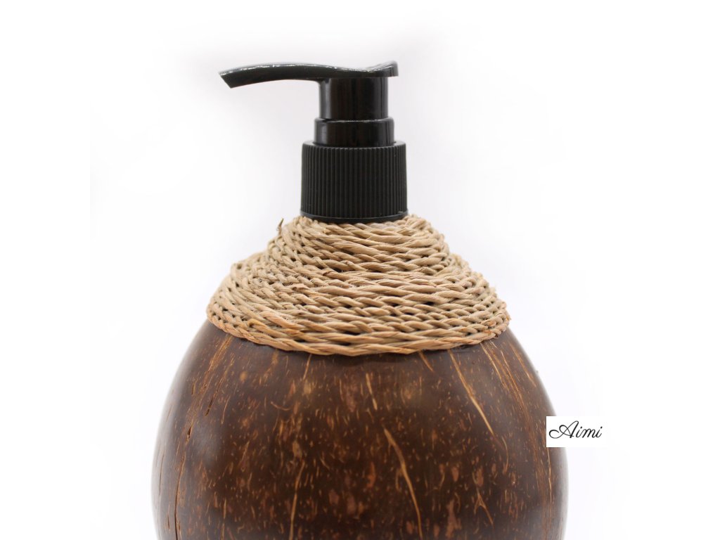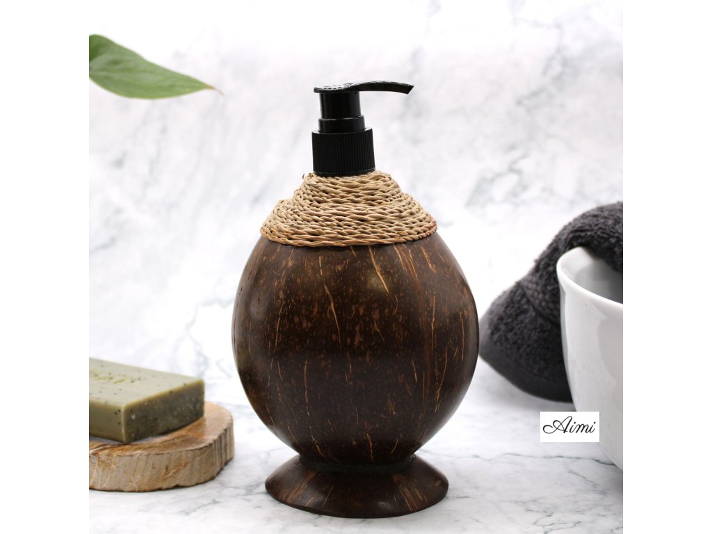 Tento dávkovač mydla má robustnú pumpu. Sú vyrobené z kokosovej škrupiny, prírodného prúteného lana. Tento opakovane použiteľný dávkovač mydla má kapacitu 150 ml. Pumpička a fľaštička vo vnútri, ktorá obsahuje tekuté mydlá, sú vyrobené z plastu.