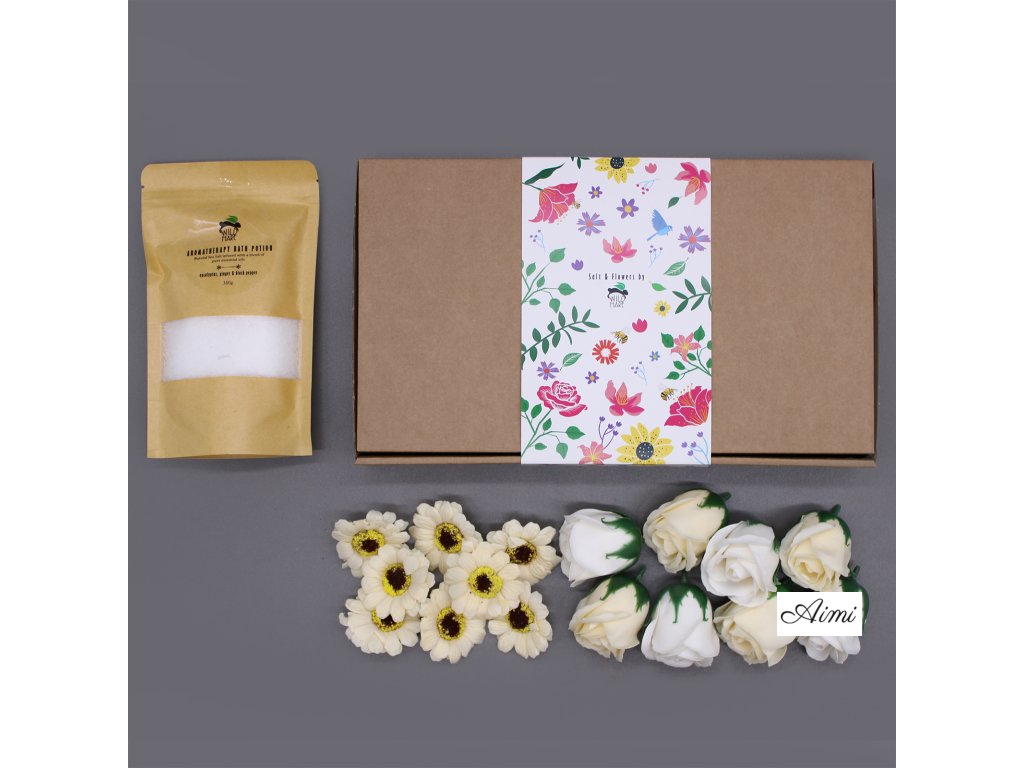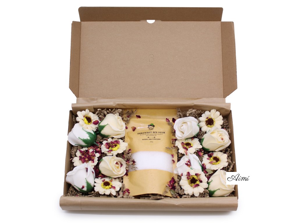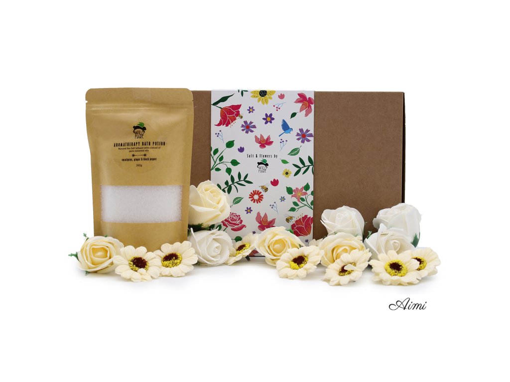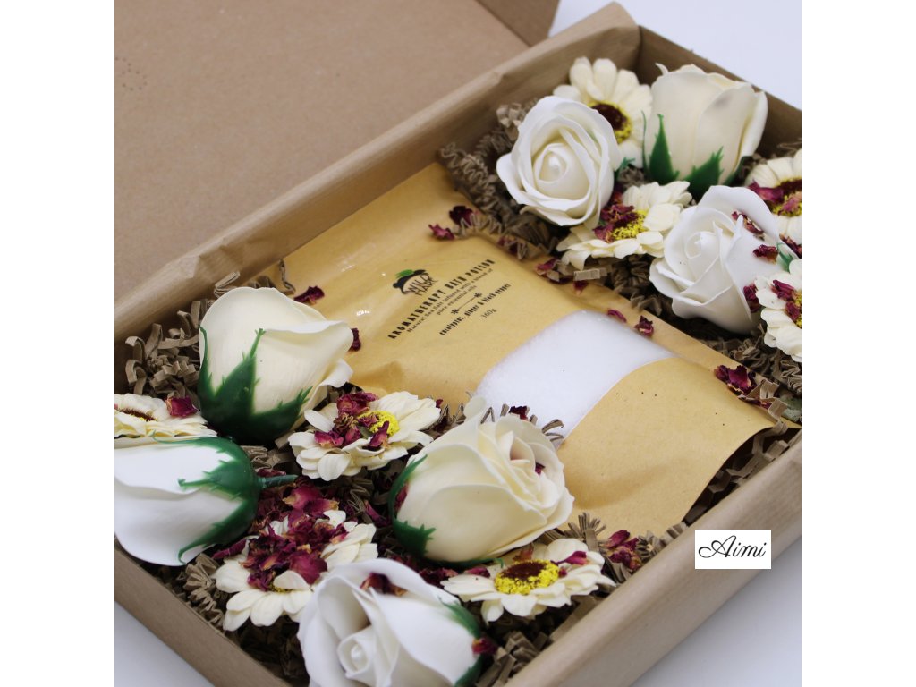 V elegantných darčekových Krabičkách nájdete farebne zladené kúpeľové soli, mydlové ruže a slnečnice. Kombinácia prírodnej soli a éterických olejov poskytne výnimočný aromaterapeutický zážitok. Jedinečné aromatické zmesi majú stimulačný, relaxačný, detoxikačný alebo hrejivý účinok.