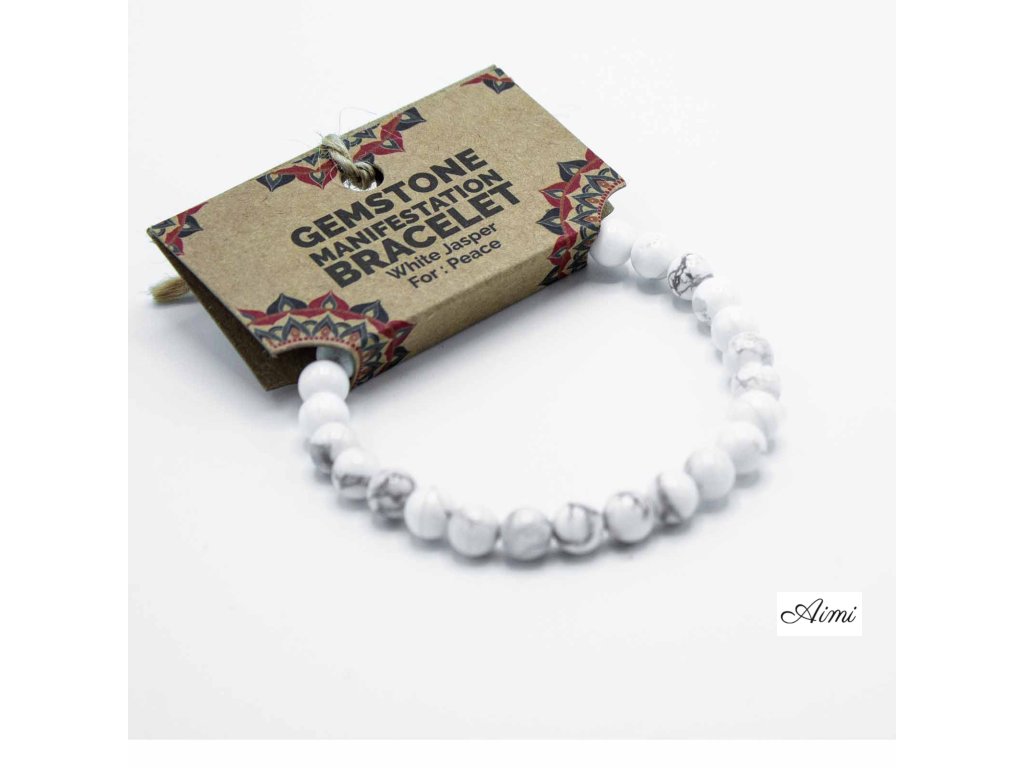Objavte vnútorný pokoj a mier s naším Manifestačným náramkom z bieleho jaspisu. Upokojujúca prítomnosť tohto drahokamu vám pomáha prejaviť pokojný stav mysle uprostred životných výziev.