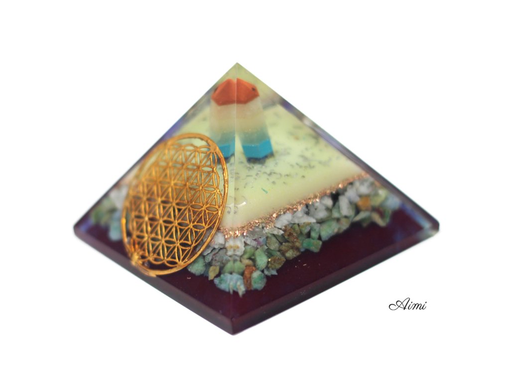 Orgonit Pyramída 70mm - Kvet Života je zmes katalyzovanej živice zo sklených vlákien s kovovými hoblinami naliatych do foriem. Orgonit sa stal veľmi populárnym ako duchovný liečebný nástroj a ako ochrana proti elektromagnetickému znečisteniu.