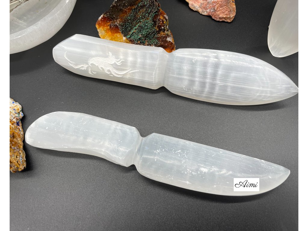 Tieto predmety sú dekoratívne, ale majú silný ezoterický význam. Selenitové nože dokážu prerušiť negatívne väzby, či už s inou osobou, situáciou alebo miestom. Symbolicky tieto väzby prerušia a bránia nám v napredovaní.