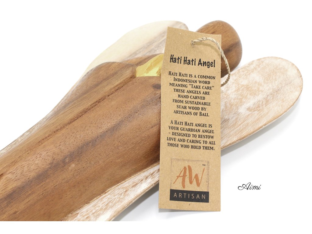 Hati-Hati Veľkoobchodný drevený Anjel Láska 20 cm je ručne vyrezávaný v horských dedinách zo Suar - obnoviteľného tvrdého dreva. Toto drevo sa používa na výrobu krásnych a často svätých obrazov. Hati-Hati Anjeli sú krásne darčeky pre ľudí na ktorých vám záleží. Každý anjel bol starostlivo ručne vyrezaný, sušený na slnku, leštený a maľovaný remeselníkmi vo vidieckych oblastiach. Hat-hati je známe indonézske slovo, ktoré znamená starať sa. Takže títo anjeli sú navrhnutí tak, aby prinášali lásku a starostlivosť všetkým, ktorí ich držia.