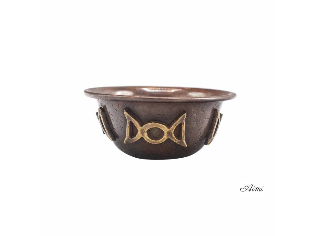 Dodajte svojim rituálom nádych vintage elegancie s našou starožitnou medenou rituálnou misou s rozmermi 8 x 4 cm a zdobenou očarujúcim dizajnom Trojitý mesiac. Je to dokonalá nádoba na obetiny, očistné rituály alebo jednoducho ako podmanivý dekoratívny kúsok.